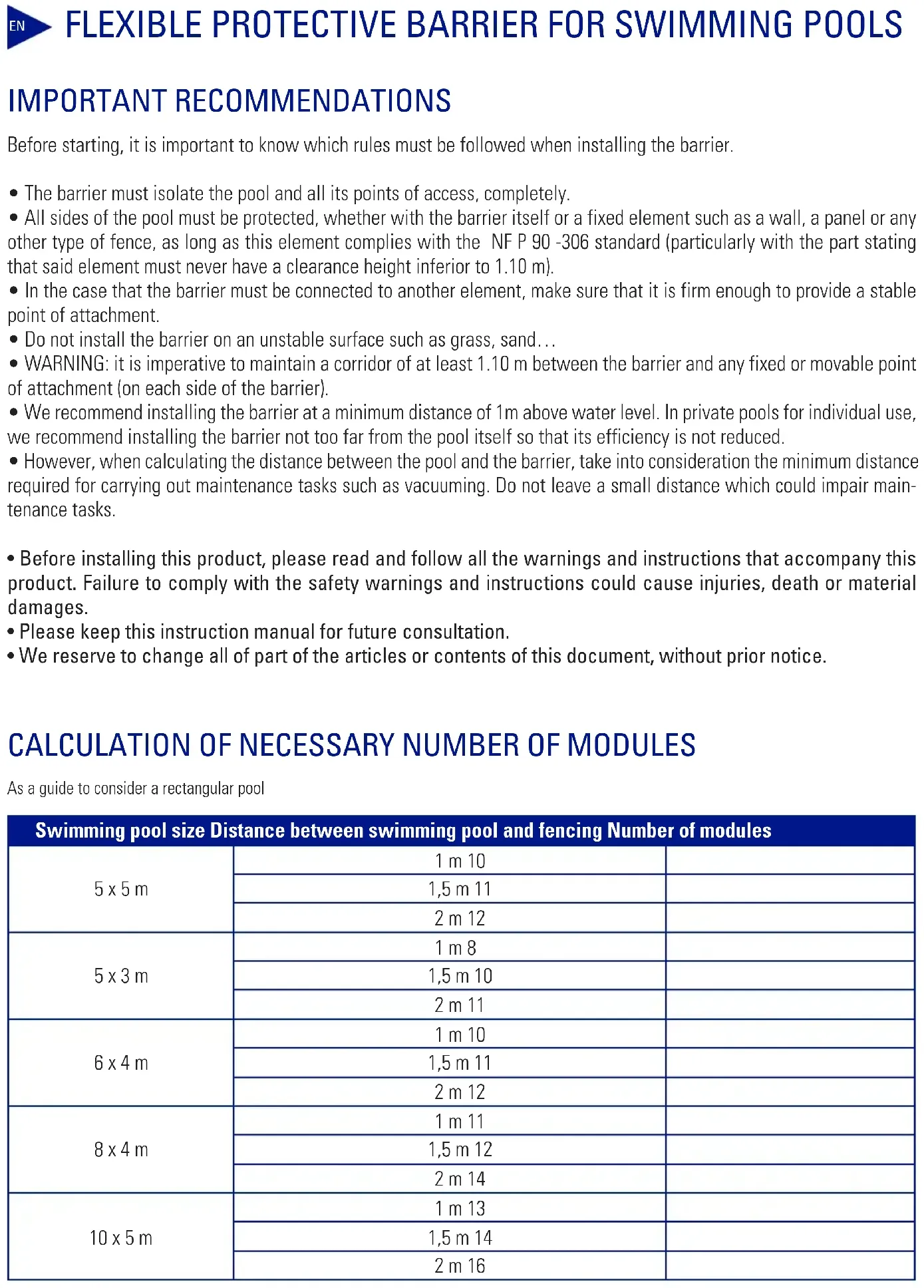 - All sides of the pool must be protected, whether with the barrier itself or a fixed element such as a wall, a panel or any other type of fence, as long as this element complies with the NF P 90 -306 standard (particularly with the part stating that said element must never have a clearance height inferior to 1.10 m).