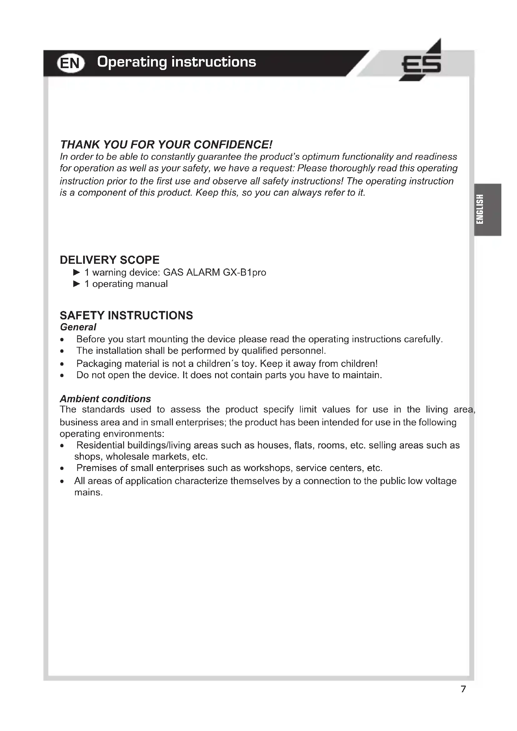 - All areas of application characterize themselves by a connection to the public low voltage mains. DELIVERY SCOPE ► 1 warning device: GAS ALARM GX-B1pro ► 1 operating manual Operating instructions EN8 ENGLISH Data diagram Sensor Gas type Minimum concentration CO no alarm triggered Methane <5000 ppm (0,5%) Propane (isobutane) <2000 ppm (0,2%) Ethanol (acetone) <5000 ppm (0,5%) It is essential to observe the prescribed position of the alarm unit! For your own safety and reassurance, please obtain information from your supplier regarding their gas type and its properties! INSTALLATION INSTRUCTIONS The GAS ALARM GX-B1pro may only be installed in dry, interior rooms and must be correctly placed according to the type of gas to ensure faultless operation of the alarm system. APPROPRIATE USE The GAS ALARM GX-B1pro is a gas warning device for city, natural and liqueed gases and can already deliver a warning at a gas concentration that lies well below life-threatening values. This monitoring system is, therefore, in line with its purpose, set to a very high sen- sitivity (see table TECHNICAL DATA). The alarm is signalled acoustically and optically. The unit is suitable for normal household use and may not be used in areas at risk of explosion. Another use of the device as described above is not authorized. TECHNICAL SPECIFICATIONS Operating voltage: 230 (+/-10%) V AC / 50-60 Hz Power consumption: approx. 3 W Protection type: IP 20 Acoustic pressure sounder: 90 dB @ 10 cm Type Sensor: catalyitc Operating temperature: -10 °C / +50 °C Storage temperaturer: -20 °C / +70 °C Humidity (ambient): 5–90 % RH (non-condensing) Service life: approx. 5 years Dimensions (HxWxD): 118x60x44 mm9 ENGLISH GAS ALARM GAS ALARM Placing of the unit for city and natural gas (methane CH4): Plug the unit into a socket at a height of 15-30 cm below the ceiling but no further than 4 m from the gas appliance. Note that the alarm unit must be mounted above the highest door or window opening in the room. City and natural gas (methane) are lighter than air and will therefore always rise. Placing of the alarm unit for liqueed gas (propane C3H8 / butane C4H10): Plug the unit into a socket at a height of 15-30 cm above the oor but no further than 4 m from the gas appliance. Escaping liqueed gas is heavier than air and sinks to the oor. It spreads across the oor rat- her like water - but as a gas - and always seeks the lowest point. The alarm unit may not be used in the following positions: