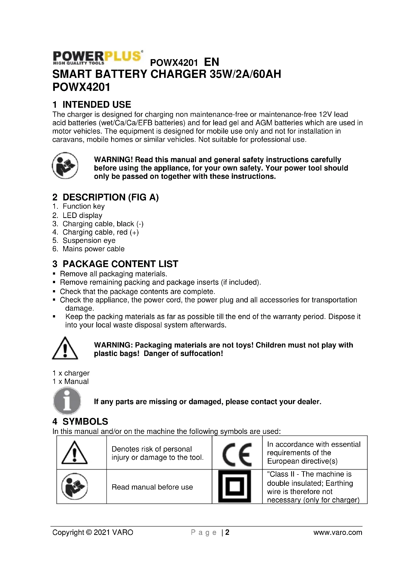 The charger is a microprocessor controlled automatic charger, i.e. it is suitable in particular for charging maintenance-free batteries and for the long-term charging and maintenance-charging of batteries which are not in constant use, e.g. for classic cars, recreational vehicles, lawn tractors and the like. The integrated microprocessor enables charging in several steps. ThePOWX4201 EN Copyright © 2021 VARO P a g e | 5 www.varo.com final charging step, maintenance charging, maintains the battery capacity at 95–100% and therefore keeps the battery fully charged at all times. The charging operation does not need to be monitored. However, do not leave the battery unattended if you charge it over an extended period of time, so that you can disconnect it from the mains power supply in the event of a fault in the charger.
