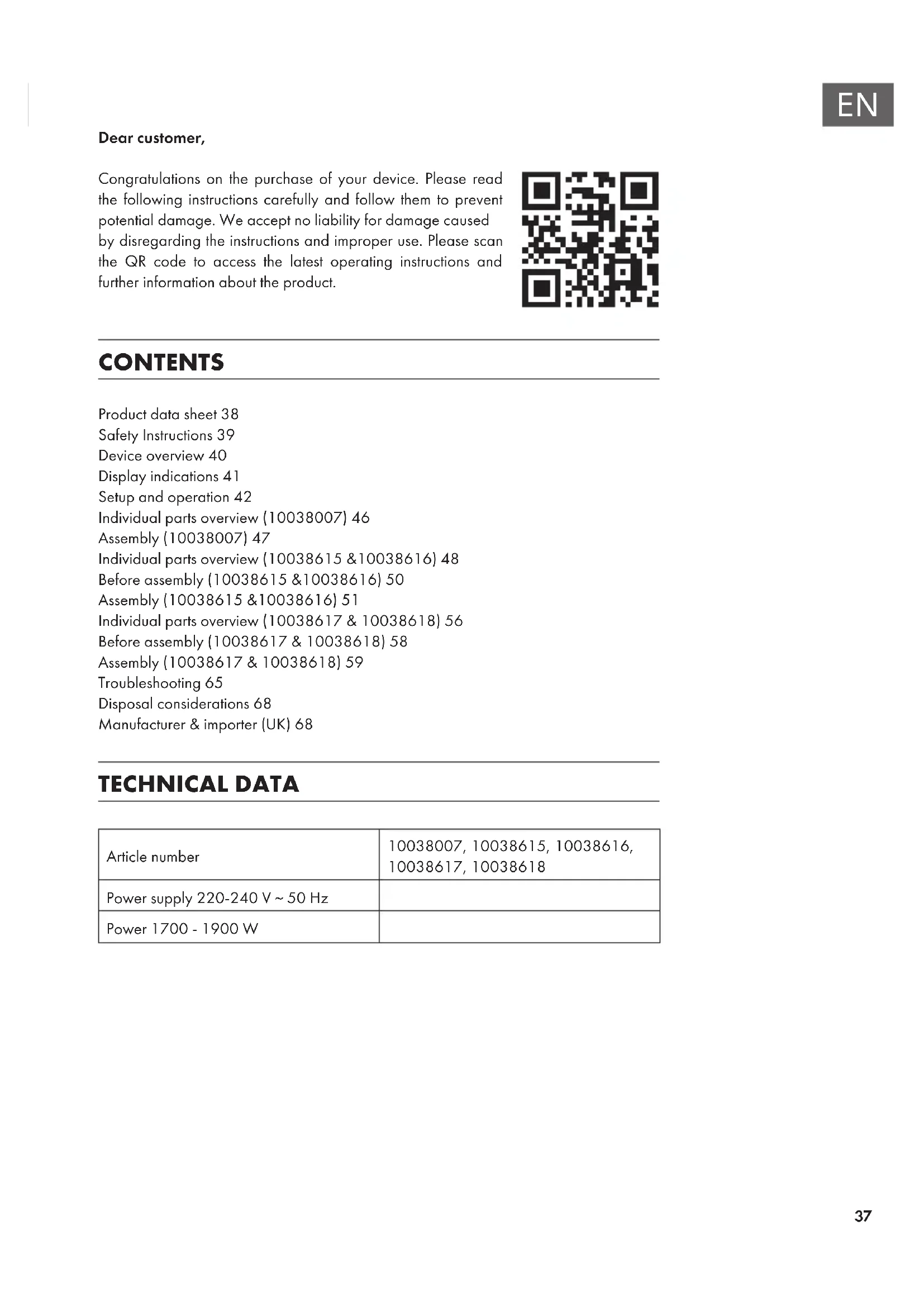 Dear customer, Congratulations on the purchase of your device. Please read the following instructions carefully and follow them to prevent potential damage. We accept no liability for damage caused by disregarding the instructions and improper use. Please scan the QR code to access the latest operating instructions and further information about the product. CONTENTS Product data sheet38 Safety Instructions39 Device overview40 Display indications41 Setup and operation42 Individual parts overview (10038007)46 Assembly (10038007)47 Individual parts overview (10038615 &10038616)48 Before assembly (10038615 &10038616)50 Assembly (10038615 &10038616)51 Individual parts overview (10038617 & 10038618)56 Before assembly (10038617 & 10038618)58 Assembly (10038617 & 10038618)59 Troubleshooting65 Disposal considerations68 Manufacturer & importer (UK)68 TECHNICAL DATA Article number 10038007, 10038615, 10038616, 10038617, 10038618 Power supply 220-240 V ~ 50 Hz Power 1700 - 1900 W38