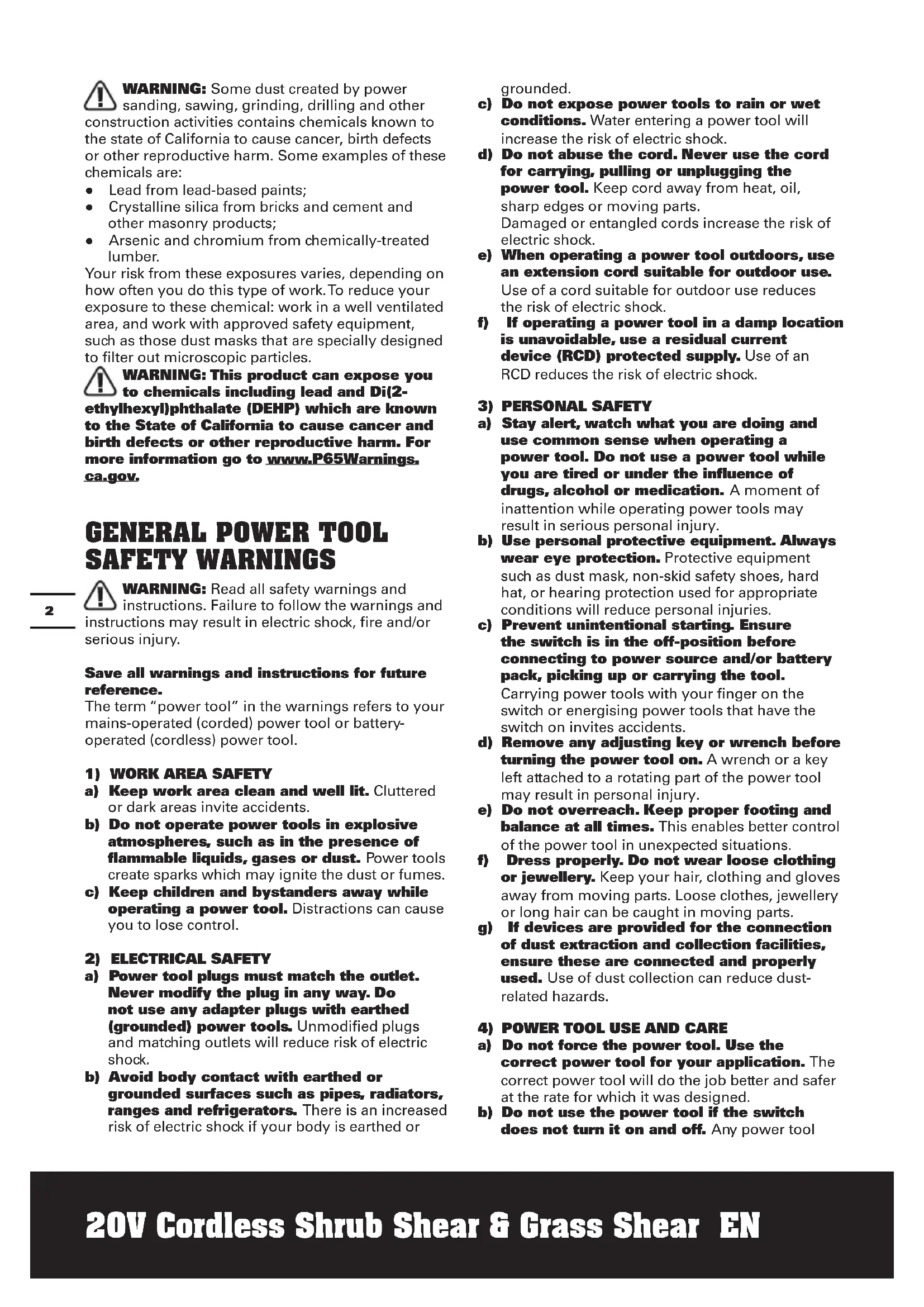a) Do not force the power tool. Use the correct power tool for your application. The correct power tool will do the job better and safer at the rate for which it was designed. b) Do not use the power tool if the switch does not turn it on and off. Any power tool20V Cordless Shrub Shear & Grass Shear EN