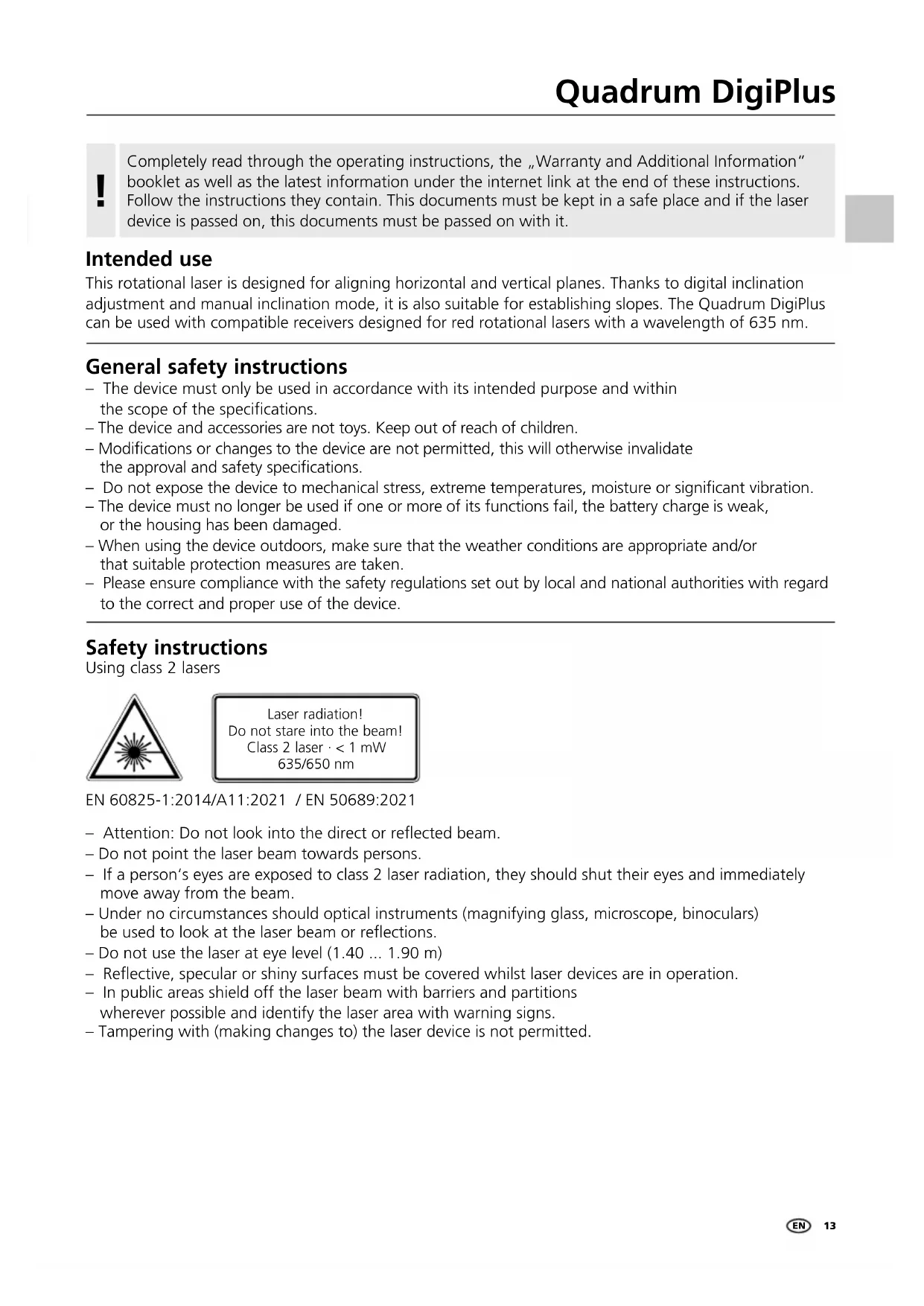 Intended use This rotational laser is designed for aligning horizontal and vertical planes. Thanks to digital inclination adjustment and manual inclination mode, it is also suitable for establishing slopes. The Quadrum DigiPlus can be used with compatible receivers designed for red rotational lasers with a wavelength of 635 nm. General safety instructions – The device must only be used in accordance with its intended purpose and within the scope of the specications. – The device and accessories are not toys. Keep out of reach of children. – Modications or changes to the device are not permitted, this will otherwise invalidate the approval and safety specications. – Do not expose the device to mechanical stress, extreme temperatures, moisture or signicant vibration. – The device must no longer be used if one or more of its functions fail, the battery charge is weak, or the housing has been damaged. – When using the device outdoors, make sure that the weather conditions are appropriate and/or that suitable protection measures are taken. – Please ensure compliance with the safety regulations set out by local and national authorities with regard to the correct and proper use of the device. EN 60825-1:2014/A11:2021 / EN 50689:2021 – Attention: Do not look into the direct or reected beam. – Do not point the laser beam towards persons. – If a person‘s eyes are exposed to class 2 laser radiation, they should shut their eyes and immediately move away from the beam. – Under no circumstances should optical instruments (magnifying glass, microscope, binoculars) be used to look at the laser beam or reections. – Do not use the laser at eye level (1.40 ... 1.90 m) – Reective, specular or shiny surfaces must be covered whilst laser devices are in operation. – In public areas shield off the laser beam with barriers and partitions wherever possible and identify the laser area with warning signs. – Tampering with (making changes to) the laser device is not permitted. Laser radiation! Do not stare into the beam! Class 2 laser · < 1 mW 635/650 nm Safety instructions Using class 2 lasers14