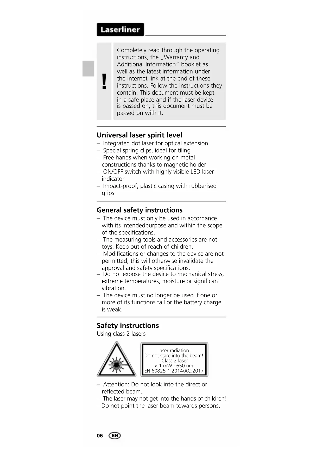 Danger – powerful magnetic fields Powerful magnetic fields can adversely affect persons with active medical implants (e.g. pacemaker) as well as electromechanical devices (e.g. magnetic cards, mechanical clocks, precision mechanics, hard disks). With regard to the effect of powerful magnetic fields on persons, the applicable national stipulations and regulations must be complied with such as BGV B11 §14 „electromagnetic fields“ (occupational health and safety - electromagnetic fields) in the Federal Republic of Germany. To avoid interference/disruption, always keep the implant or device a safe distance of at least 30cm away from the magnet. Inserting batteries Open the battery compartment and insert batteries according to the symbols. Be sure to pay attention to polarity. – The measuring device complies with electro- magnetic compatibility regulations and limits in accordance with the EMC Directive 2014/30/EU. – Local operating restrictions – for example, in hospitals, aircraft, petrol stations or in the vicinity of people with pacemakers – may apply. Electronic devices can potentially cause hazards or interference or be subject to hazards or interference. Safety instructions Dealing with electromagnetic radiation – If a person‘s eyes are exposed to class 2 laser radiation, they should shut their eyes and immediately move away from the beam. – Do not expose the device to mechanical stress, extreme temperatures, moisture or signicant vibration. – The device must only be used in accordance with its intended purpose and within the scope of the specications. Modications or changes to the device are not permitted, this will otherwise invalidate the approval and safety specications. EN08