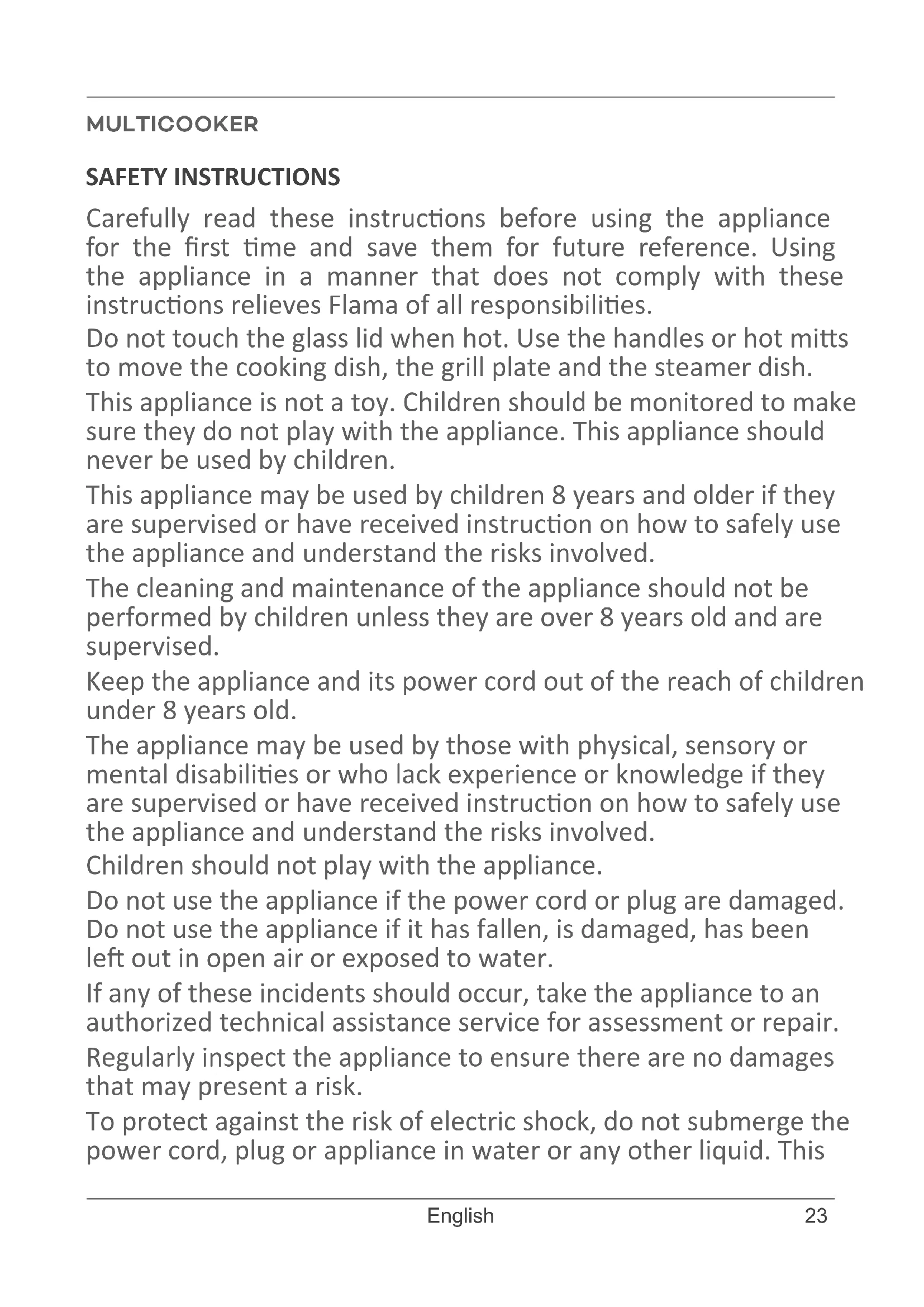 Limpie el aparato y las piezas después de cada uso. Antes de limpiar, desenchufe el aparato y déjelo enfriar completamente. Lave la bandeja de cocción, la parrilla, la vaporera y la tapa con agua caliente y un detergente suave. Limpie y seque con un paño suave y seco. No use limpiadores abrasivos ya que pueden dañar la supercie anadherente. Limpie la base solo con un paño húmedo y séquela con un paño suave y seco; no la sumerja en líquidos. Nunca sumerja la base en agua. NOTA: No use limpiadores abrasivos, estropajos o productos que no se consideren seguros para usar en revesmientos anadherentes. Cualquier otro servicio/reparación debe ser realizado por un representante de servicio autorizado.23 English MULTICOOKER SAFETY INSTRUCTIONS Carefully read these instrucons before using the appliance for the rst me and save them for future reference. Using the appliance in a manner that does not comply with these instrucons relieves Flama of all responsibilies. Do not touch the glass lid when hot. Use the handles or hot mis to move the cooking dish, the grill plate and the steamer dish. This appliance is not a toy. Children should be monitored to make sure they do not play with the appliance. This appliance should never be used by children. This appliance may be used by children 8 years and older if they are supervised or have received instrucon on how to safely use the appliance and understand the risks involved. The cleaning and maintenance of the appliance should not be performed by children unless they are over 8 years old and are supervised. Keep the appliance and its power cord out of the reach of children under 8 years old. The appliance may be used by those with physical, sensory or mental disabilies or who lack experience or knowledge if they are supervised or have received instrucon on how to safely use the appliance and understand the risks involved. Children should not play with the appliance. Do not use the appliance if the power cord or plug are damaged. Do not use the appliance if it has fallen, is damaged, has been le out in open air or exposed to water. If any of these incidents should occur, take the appliance to an authorized technical assistance service for assessment or repair. Regularly inspect the appliance to ensure there are no damages that may present a risk. To protect against the risk of electric shock, do not submerge the power cord, plug or appliance in water or any other liquid. This24 www.ama.pt may cause injury and/or damage to the appliance. Keep the power cord away from hot surfaces and do not cover the appliance’s venlaon systems. Do not leave the power cord hanging from the edge of a table or countertop. Do not place the appliance near or on top of a gas stove, any type of electric stove, electric cooktops or hot oven. Turn o the appliance by removing the plug from the electrical socket aer each use and when cleaning. Let the appliance cool before cleaning or storing it. All maintenance aside from cleaning should be performed by an authorized technical assistance service. The use of accessories not recommended or sold by Flama may cause res, electric shock, injuries or damage to the appliance. Only use the provided cooking trays and grill plate. Do not use any other cooking tray or grill plate on the heang base. The appliance is not meant to be operated using an external mer or separate remote control system. This appliance was designed exclusively for domesc use, not for professional or industrial use. Do not use the appliance in moving vehicles or boats. Improper use may cause injuries. This appliance is not meant to be used in domesc and analogous situaons such as: - Cooking areas reserved for employees of stores, oces and other professional environments. - Country homes. - By clients of hotels, motels and other residence-type environments. - In guesthouse environments. To protect against re, do not use the appliance in the presence of explosive and/or ammable vapors. Be very careful moving the appliance when it contains food or other hot liquids. Do not move the appliance while it is cooking.25 English Place the appliance on a dry, stable, at and heat- and water- resistant surface, away from water splashes and any other sources of heat. This appliance must be posioned in a stable manner, away from any heat source and with the handles posioned to avoid spilling hot liquids. Posion the appliance far away from walls, curtains and other materials sensive to heat and steam. The appliance should be placed at least 20 cm (8 in) away from any other object. When using the appliance, provide adequate space above and on all sides for air to circulate. Always make sure the appliance is correctly assembled before use. Never turn on the appliance if either the cooking tray or grill plate is not on the heang base. Do not place foods or liquids directly on the heang base. Only the cooking tray and the grill plate were designed to work with the heang base. Never operate the appliance without foods and liquids in the cooking tray or grill plate. Make sure that the foods or liquids being cooked ll the cooking tray at least halfway before turning on the appliance. The glass lid is not unbreakable. If hit with strength, the glass may break or weaken and later break into small pieces with no apparent cause. Make sure that the lid is correctly placed on the cooking tray or steam tray. Do not place the cooking tray or grill plate on any surface that could be damaged by heat. Do not use the cooking tray, the grill plate, the steam tray or the lid in a convenonal oven. Do not let water drip from the lid to the heang base. Keep the appliance and all components clean. Follow the cleaning and maintenance instrucons. Do not leave plasc or heat-sensive utensils inside the cooking26 www.ama.pt tray or grill plate during operaon. Always plug the appliance into a grounded outlet. Keep the appliance and its power cord out of the reach of children. If the power cord is damaged,