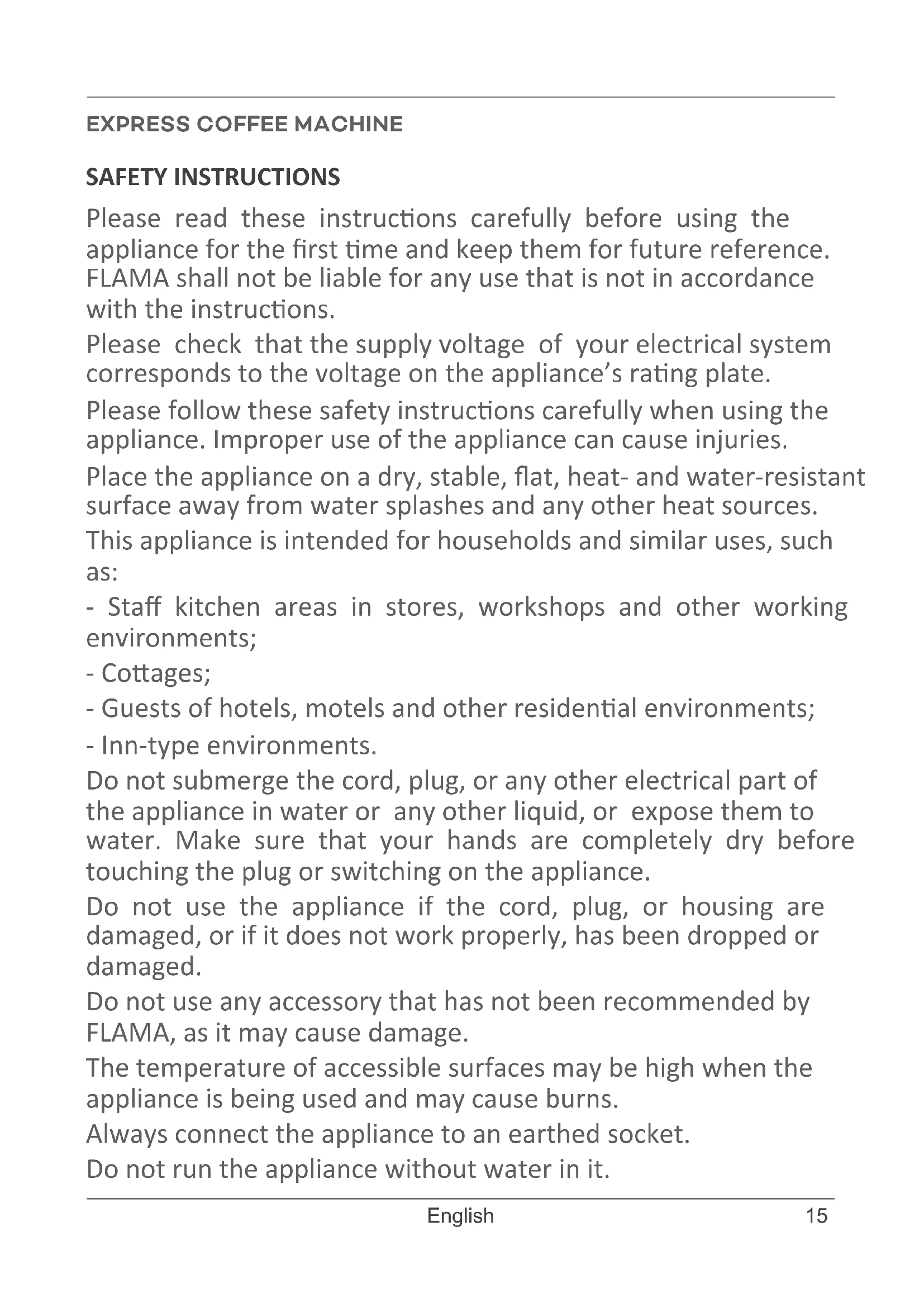 SAFETY INSTRUCTIONS Please read these instrucons carefully before using the appliance for the rst me and keep them for future reference. FLAMA shall not be liable for any use that is not in accordance with the instrucons. Please check that the supply voltage of your electrical system corresponds to the voltage on the appliance’s rang plate. Please follow these safety instrucons carefully when using the appliance. Improper use of the appliance can cause injuries. Place the appliance on a dry, stable, at, heat- and water-resistant surface away from water splashes and any other heat sources. This appliance is intended for households and similar uses, such as: - Sta kitchen areas in stores, workshops and other working environments; - Coages; - Guests of hotels, motels and other residenal environments; - Inn-type environments. Do not submerge the cord, plug, or any other electrical part of the appliance in water or any other liquid, or expose them to water. Make sure that your hands are completely dry before touching the plug or switching on the appliance. Do not use the appliance if the cord, plug, or housing are damaged, or if it does not work properly, has been dropped or damaged. Do not use any accessory that has not been recommended by FLAMA, as it may cause damage. The temperature of accessible surfaces may be high when the appliance is being used and may cause burns. Always connect the appliance to an earthed socket. Do not run the appliance without water in it.16 www.ama.pt Do not move or switch o the appliance when it is working. This appliance may be used by children aged 8 and over if they are supervised or have received instrucons concerning the safe use of the appliance and understand the risks involved. Cleaning and maintenance must not be carried out by children unless they are over 8 years old and supervised. Keep the appliance and its power cord out of the reach of children under the age of 8. This appliance may be used by persons with limited physical, sensory or mental abilies or lack of experience and knowledge, if they are supervised or have received instrucons concerning the safe use of the appliance and understand the risks involved. Children should be supervised to ensure they do not play with the appliance. NOTE: this appliance was subject to a quality control prior to its placement on the market to ensure it is working properly. Aer the control, the appliance is thoroughly cleaned, so there may be some water le inside. Do not use the appliance if it is not working properly. Please disconnect the appliance from the power supply by removing the plug from the power socket aer each use and when cleaning. Please allow it to cool down before carrying out with any cleaning or storage operaons. If the power cord is damaged, have it replaced at an Authorized Flama Technical Assistance Service in order to avoid a hazard. Any intervenon other than cleaning must be carried out only by authorized FLAMA agents. This product complies with the Low-Voltage and Electromagnec Compability Direcves. This instrucon manual is also available in PDF format at www. ama.pt .17 English DESCRIPTION