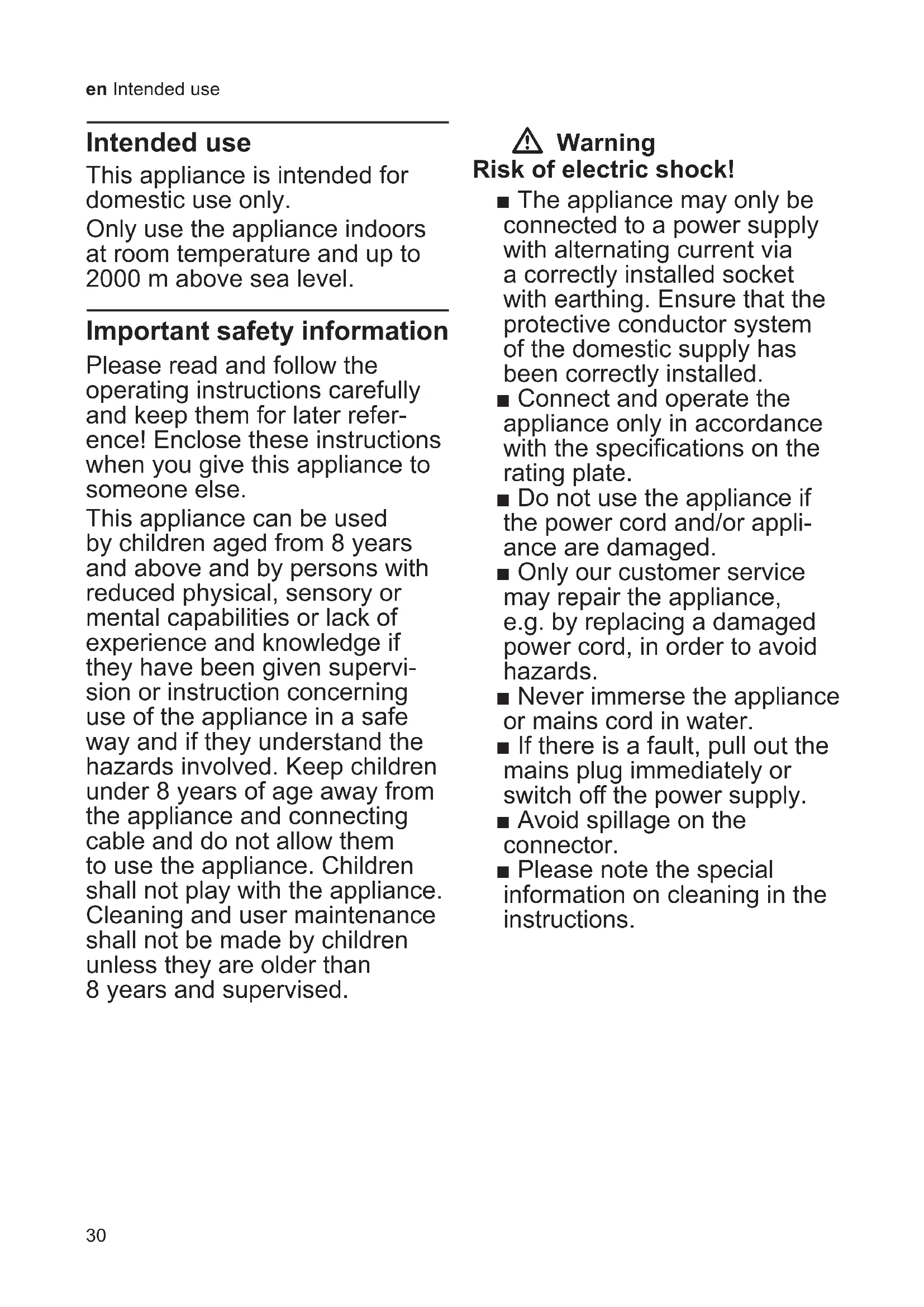 - calc‘nClean Tips on energy saving 48 Frost protection 49 Storing accessories 49 Accessories 49 Disposal49 Guarantee 49 Simple troubleshooting 50 Technical specifications 5330 en Intended use Intended use This appliance is intended for domestic use only. Only use the appliance indoors at room temperature and up to 2000 m above sea level. Important safety information Please read and follow the operating instructions carefully and keep them for later refer- ence! Enclose these instructions when you give this appliance to someone else. This appliance can be used by children aged from 8 years and above and by persons with reduced physical, sensory or mental capabilities or lack of experience and knowledge if they have been given supervi- sion or instruction concerning use of the appliance in a safe way and if they understand the hazards involved. Keep children under 8 years of age away from the appliance and connecting cable and do not allow them to use the appliance. Children shall not play with the appliance. Cleaning and user maintenance shall not be made by children unless they are older than 8 years and supervised. W Warning Risk of electric shock! ■ The appliance may only be connected to a power supply with alternating current via a correctly installed socket with earthing. Ensure that the protective conductor system of the domestic supply has been correctly installed. ■ Connect and operate the appliance only in accordance with the specications on the rating plate. ■ Do not use the appliance if the power cord and/or appli- ance are damaged. ■ Only our customer service may repair the appliance, e.g. by replacing a damaged power cord, in order to avoid hazards. ■ Never immerse the appliance or mains cord in water. ■ If there is a fault, pull out the mains plug immediately or switch o the power supply. ■ Avoid spillage on the connector. ■ Please note the special information on cleaning in the instructions. Intended use Important safety information31 p. 47