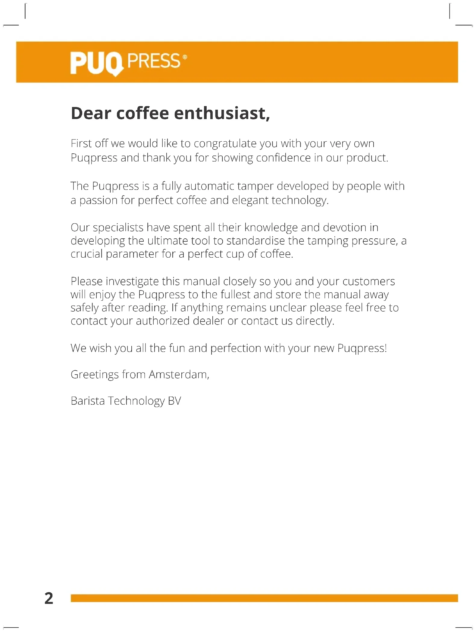 FR2 Dear coee enthusiast, First o we would like to congratulate you with your very own Puqpress and thank you for showing condence in our product. The Puqpress is a fully automatic tamper developed by people with a passion for perfect coee and elegant technology. Our specialists have spent all their knowledge and devotion in developing the ultimate tool to standardise the tamping pressure, a crucial parameter for a perfect cup of coee. Please investigate this manual closely so you and your customers will enjoy the Puqpress to the fullest and store the manual away safely after reading. If anything remains unclear please feel free to contact your authorized dealer or contact us directly. We wish you all the fun and perfection with your new Puqpress! Greetings from Amsterdam, Barista Technology BV3 precision coee tamper
