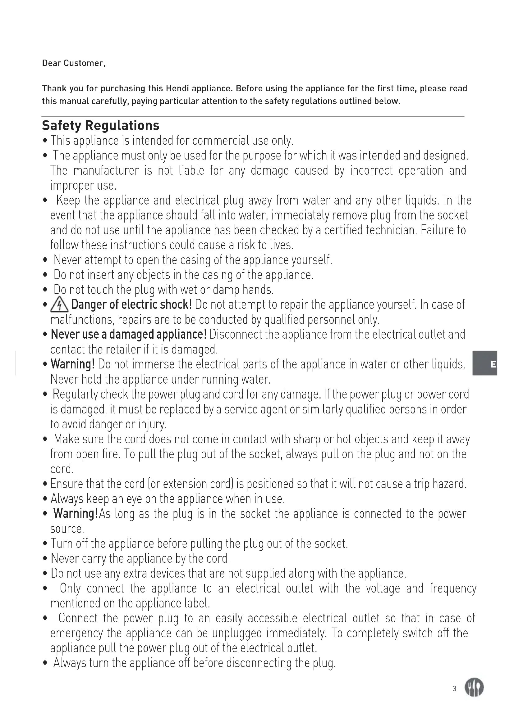 Troubleshooting Fault Symptom Possible cause Possible solution Appliance does not do anything Orange light doesn’t light No mains voltage Check the electrical installation. Switch light defective Hi-limiter (thermal cut-out) tripped. Reset the Hi-limiter (thermal cut-out) (See RESET on page 6) Hi-limiter (thermal cut-out) defective Contact your supplier Thermostat defective Contact your supplier Appliance does not reach the set temperature. Long frying time. Thermostat defective Contact your supplier Element defective Contact your supplier If after these controls, the malfunctioning continues, it is advisable to contact technical assistance. In case of any doubt, always contact your supplier! Technical specification Item no. 205808 205815 205822 205839 205846 205853 Operating voltage and frequency 230V~ 50Hz Rated power 3000W 3300W 3500W 3500W x 2 3000W x 2 3300W x 2 Protection class Class I Waterproof protection class IPX3 Temperature range 50-190°C Capacity 4L 6L 8L 8L x 2 4L x 2 6L x 2 Dimensions 217x380x (H)300mm 265x430 (H)290mm 265x430x (H)345mm 550x430x (H)345mm 470x420x (H)330mm 550x430x (H)290mm Net weight (approx.) 5kg 5.4kg 6kg 11kg 8.5kg 9.5kg Item no. 205860 205877 205884 205891 205907 975404 975428 Operating voltage and frequency 230-240V~ 50Hz 230V~ 50Hz Rated power 3000W 3000W 3000W x 2 3000W x 2 3000W 2200W 3500W Protection class Class I Waterproof protection class IPX3 Temperature range 50-190°C Capacity 6L 8L 6L x 2 8L x 2 4L 4L 8L Dimensions 265x430 (H)290mm 265x430 (H)290mm 550x430x (H)345mm 550x430x (H)345mm 217x380x (H)300mm 217x380x (H)300mm 265x430x (H)345mm Net weight (approx.) 5.4kg 6kg 9.5kg 11kg 5kg 5kg 6kg Remarks: Technical specification is subjected to change without prior notification.9