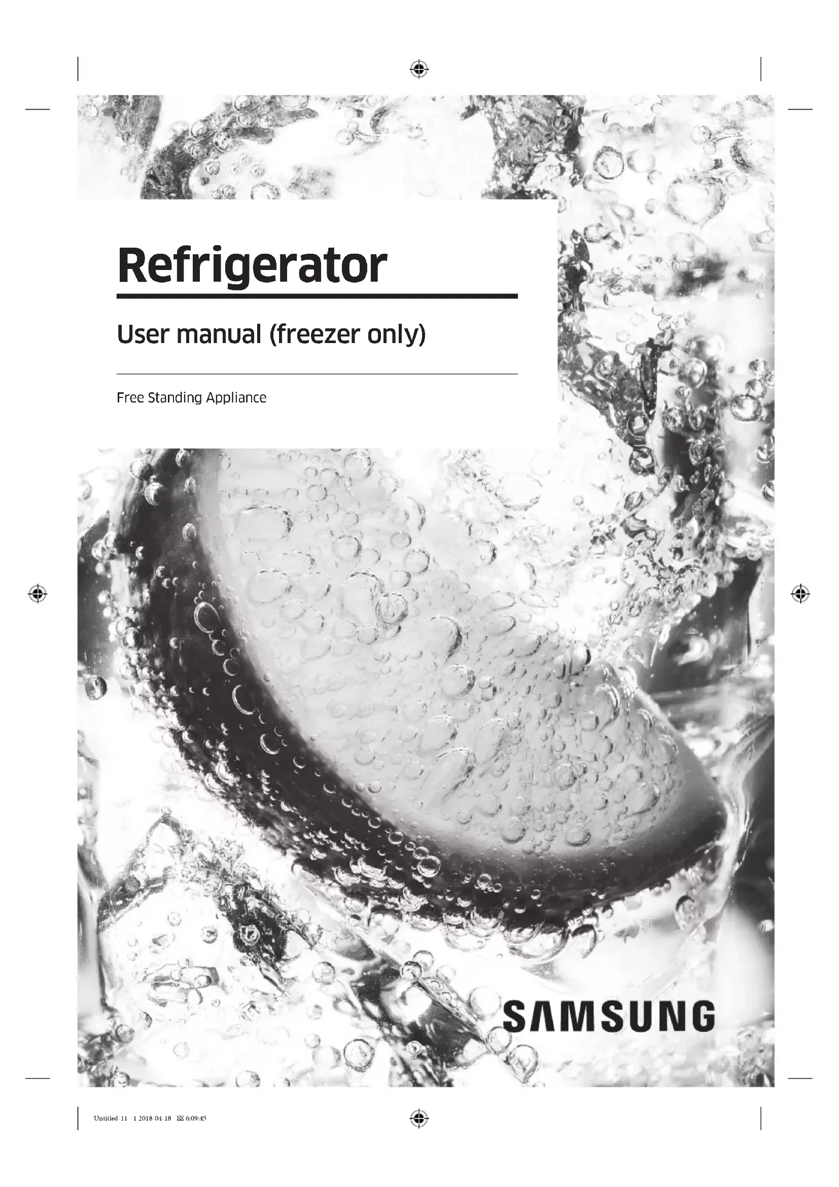 Refrigerator User manual (freezer only) Free Standing Appliance Untitled-11 1 2018-04-18 6:09:45English2 Contents Contents Safety information 3 Important safety symbols and precautions: 5 Severe warning signs for transportation and site 6 Critical installation warnings 6 Installation cautions 10 Critical usage warnings 10 Usage warning 15 Usage cautions 16 Cleaning cautions 18 Critical disposal warnings 19 Additional tips for proper usage 20 Saving Energy Tips 21 This appliance is intended to be used in household and similar applications such as 22 Instructions about the WEEE 22 Installation 23 Refrigerator at a glance 23 Step-by-step installation 24 Operations 31 Feature panel 31 Samsung Smart Home 34 Special features 36 Maintenance 41 Door reversal (applicable models only) 41 Handle and care 58 Cleaning 61 Replacement 61 Troubleshooting 62 General 62 Do you hear abnormal sounds from the refrigerator? 64 Samsung Smart Home 66 Untitled-11 2 2018-04-18 6:09:45English 3 Safety information