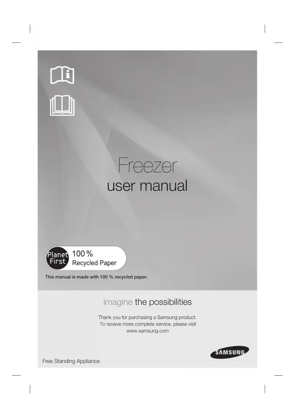 Freezer user manual imagine the possibilities Thank you for purchasing a Samsung product. To receive more complete service, please visit www.samsung.com Free Standing Appliance This manual is made with 100% recycled paper.English - 2 SAFETY INFORMATION