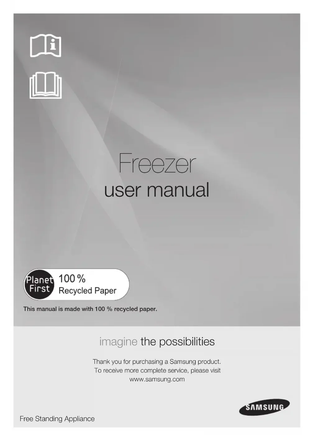 Freezer user manual imagine the possibilities Thank you for purchasing a Samsung product. To receive more complete service, please visit www.samsung.com Free Standing Appliance This manual is made with 100% recycled paper.English - 2 SAFETY INFORMATION