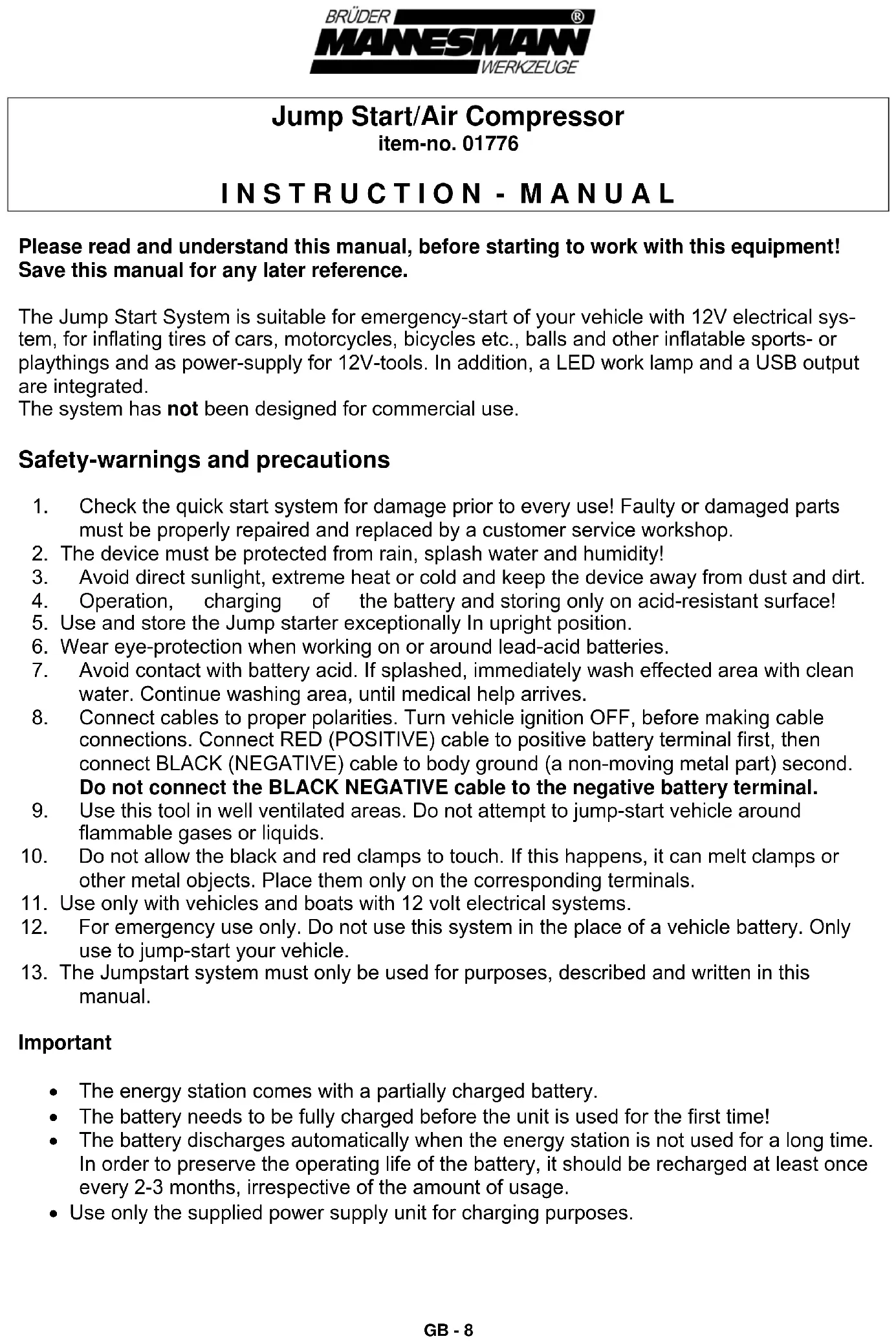 manual. Important The energy station comes with a partially charged battery. The battery needs to be fully charged before the unit is used for the first time! The battery discharges automatically when the energy station is not used for a long time. In order to preserve the operating life of the battery, it should be recharged at least once every 2-3 months, irrespective of the amount of usage. Use only the supplied power supply unit for charging purposes.GB - 9 Technical details Battery Type: Sealed, lead-acid, rechargeable, 7 amp-hours Power Output: 12 VDC, 300 amps starting power (600 A peak) Cables: Rubber insulaled ( #4) copper; Compressor: 260 PSI (18 bar) maximum pressure Output Socket: 12 VDC cigarette lighter output Discription