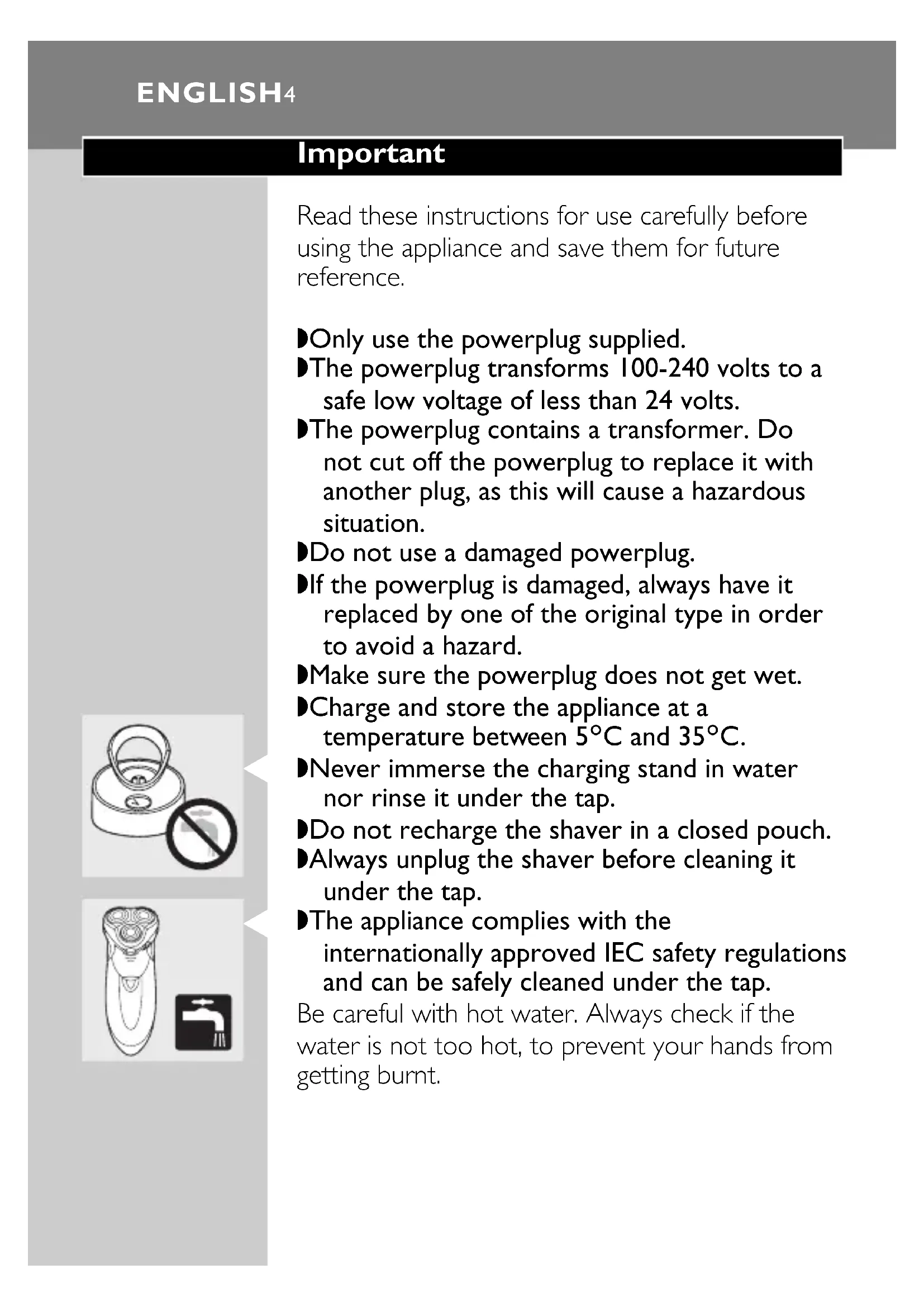 ◗ Never immerse the charging stand in water nor rinse it under the tap. ◗ Do not recharge the shaver in a closed pouch. ◗ Always unplug the shaver before cleaning it under the tap.