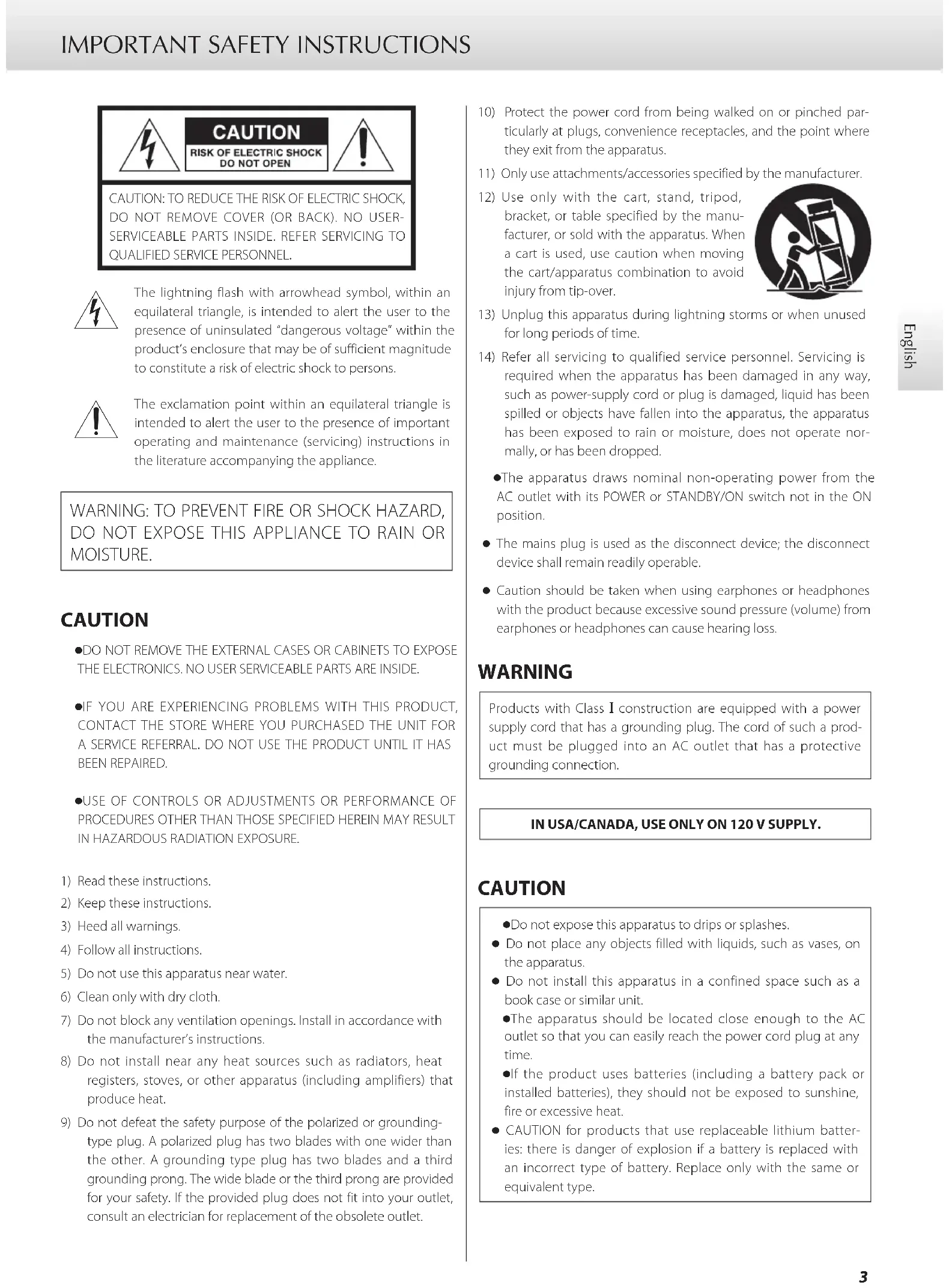 ticularly at plugs, convenience receptacles, and the point where they exit from the apparatus.11) Only use attachments/accessories specified by the manufacturer.12) Use only with the cart, stand, tripod, bracket, or table specified by the manu-facturer, or sold with the apparatus. When a cart is used, use caution when moving the cart/apparatus combination to avoid injury from tip-over.13) Unplug this apparatus during lightning storms or when unused for long periods of time.14) Refer all servicing to qualified service personnel. Servicing is required when the apparatus has been damaged in any way, such as power-supply cord or plug is damaged, liquid has been spilled or objects have fallen into the apparatus, the apparatus has been exposed to rain or moisture, does not operate nor-mally, or has been dropped. o The apparatus draws nominal non-operating power from the AC outlet with its POWER or STANDBY/ON switch not in the ON position. o The mains plug is used as the disconnect device; the disconnect device shall remain readily operable. o Caution should be taken when using earphones or headphones with the product because excessive sound pressure (volume) from earphones or headphones can cause hearing loss. WARNING Products with Class ! construction are equipped with a power supply cord that has a grounding plug. The cord of such a prod-uct must be plugged into an AC outlet that has a protective grounding connection.IN USA/CANADA, USE ONLY ON 120 V SUPPLY. CAUTION o Do not expose this apparatus to drips or splashes. o Do not place any objects filled with liquids, such as vases, on the apparatus. o Do not install this apparatus in a confined space such as a book case or similar unit. o The apparatus should be located close enough to the AC outlet so that you can easily reach the power cord plug at any time. o If the product uses batteries (including a battery pack or installed batteries), they should not be exposed to sunshine, fire or excessive heat. o CAUTION for products that use replaceable lithium batter- ies: there is danger of explosion if a battery is replaced with an incorrect type of battery. Replace only with the same or equivalent type.4 IMPORTANT SAFETY INSTRUCTIONS (continued) Model for USA This device complies with part 15 of the FCC Rules. Operation is subject to the following two conditions: (1) This device may not cause harmful interference, and (2) this device must accept any interference received, including interference that may cause unde- sired operation. This equipment has been tested and found to comply with the limits for a Class B digital device, pursuant to Part 15 of the FCC Rules. These limits are designed to provide reasonable protection against harmful interference in a residential installation. This equip- ment generates, uses, and can radiate radio frequency energy and, if not installed and used in accordance with the instructions, may cause harmful interference to radio communications. However, there is no guarantee that interference will not occur in a particular installation. If this equipment does cause harmful interference to radio or television reception, which can be determined by turning the equipment off and on, the user is encouraged to try to correct the interference by one or more of the following measures: