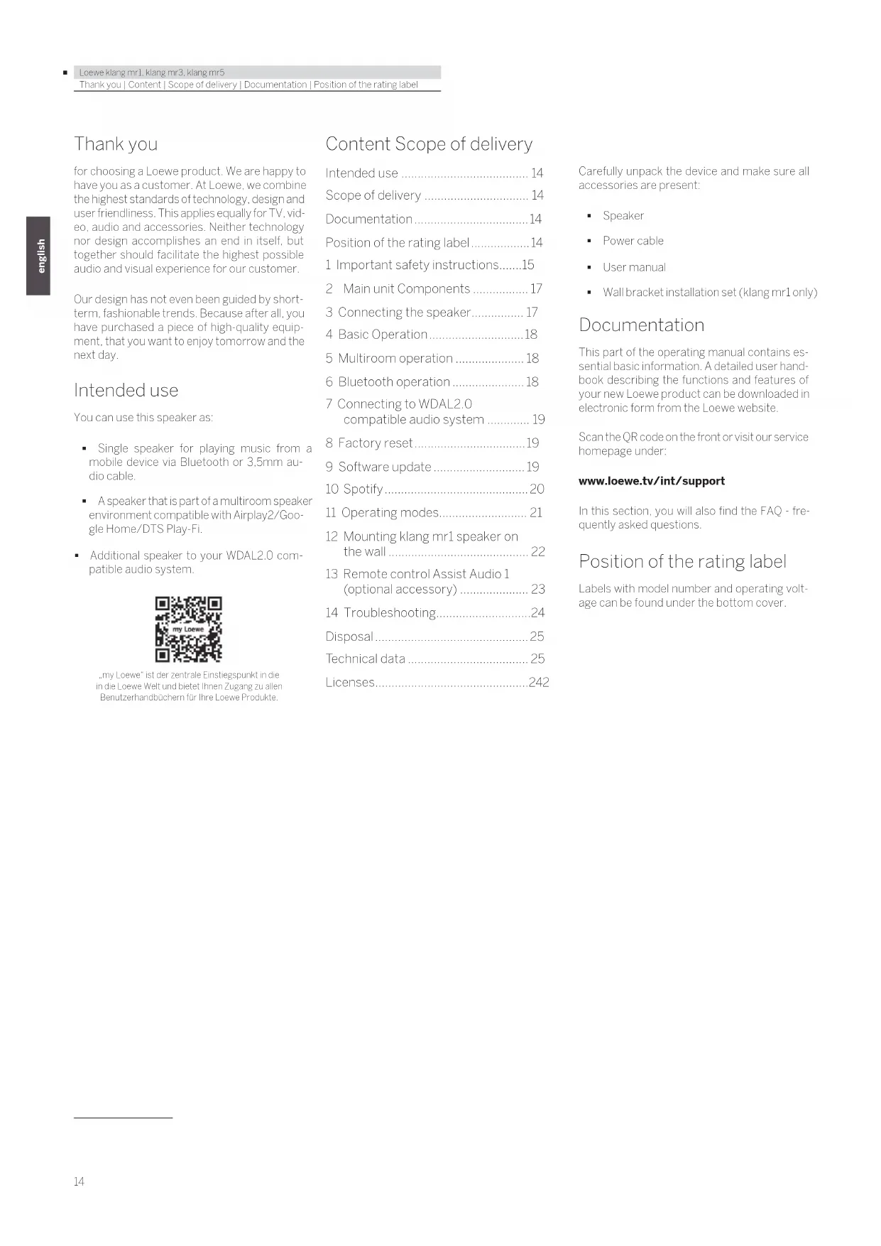 - Loewe klang mr1, klang mr3, klang mr5 deutsch english Thank you | Content | Scope of delivery | Documentation | Position of the rating label Thank you for choosing a Loewe product. We are happy to have you as a customer. At Loewe, we combine the highest standards of technology, design and user friendliness. This applies equally for TV, vid- eo, audio and accessories. Neither technology nor design accomplishes an end in itself, but together should facilitate the highest possible audio and visual experience for our customer. Our design has not even been guided by short- term, fashionable trends. Because after all, you have purchased a piece of high-quality equip- ment, that you want to enjoy tomorrow and the next day. Intended use You can use this speaker as: Single speaker for playing music from a mobile device via Bluetooth or 3,5mm au- dio cable. A speaker that is part of a multiroom speaker environment compatible with Airplay2/Goo- gle Home/DTS Play-Fi. Additional speaker to your WDAL2.0 com- patible audio system. „my Loewe“ ist der zentrale Einstiegspunkt in die in die Loewe Welt und bietet Ihnen Zugang zu allen Benutzerhandbüchern für Ihre Loewe Produkte. Content Scope of delivery Carefully unpack the device and make sure all accessories are present: Speaker Power cable User manual Wall bracket installation set (klang mr1 only) Documentation This part of the operating manual contains es- sential basic information. A detailed user hand- book describing the functions and features of your new Loewe product can be downloaded in electronic form from the Loewe website. Scan the QR code on the front or visit our service homepage under: www.loewe.tv/int/support In this section, you will also find the FAQ - fre- quently asked questions. Position of the rating label Labels with model number and operating volt- age can be found under the bottom cover. Intended use p. 14