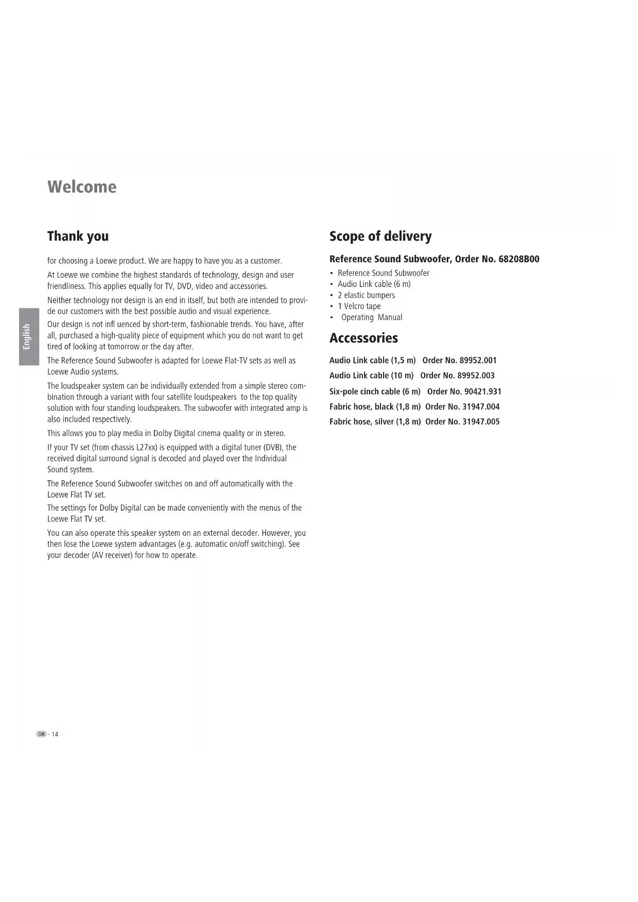 - Operating Manual Accessories Audio Link cable (1,5 m) Order No. 89952.001 Audio Link cable (10 m) Order No. 89952.003 Six-pole cinch cable (6 m) Order No. 90421.931 Fabric hose, black (1,8 m) Order No. 31947.004 Fabric hose, silver (1,8 m) Order No. 31947.00515 - English Disposal Cardboard box and packaging You have opted for a durable and technically sophisticated product. In line with national regulations regarding the disposal of packaging materials, we pay a fee to authorised recyclers who collect packaging from dealers. However, we recommend that you keep the original cardboard box and the rest of the pa- ckaging materials so that the unit can, if necessary, be transported in the safest possible conditions. The unit Important: The EU Directive 2002/96/EG governs the proper re-acceptance, handling and recycling of used electronic appliances. Old electronic appliances must therefore be disposed of sepa- rately. Never throw this set in the normal domestic waste. You can hand in your old set free of charge at identi ed collection points or at your dealer if you buy a similar new set. Other details about re-acceptance (also for non-EU countries) are available from your local administration. Cleaning Only clean your Reference Sound loudspeaker system with a damp, soft, clean cloth (without aggressive cleaning agents). For your safety For your safety and to avoid unnecessary damage to your TV set, please read and observe the following safety instructions: