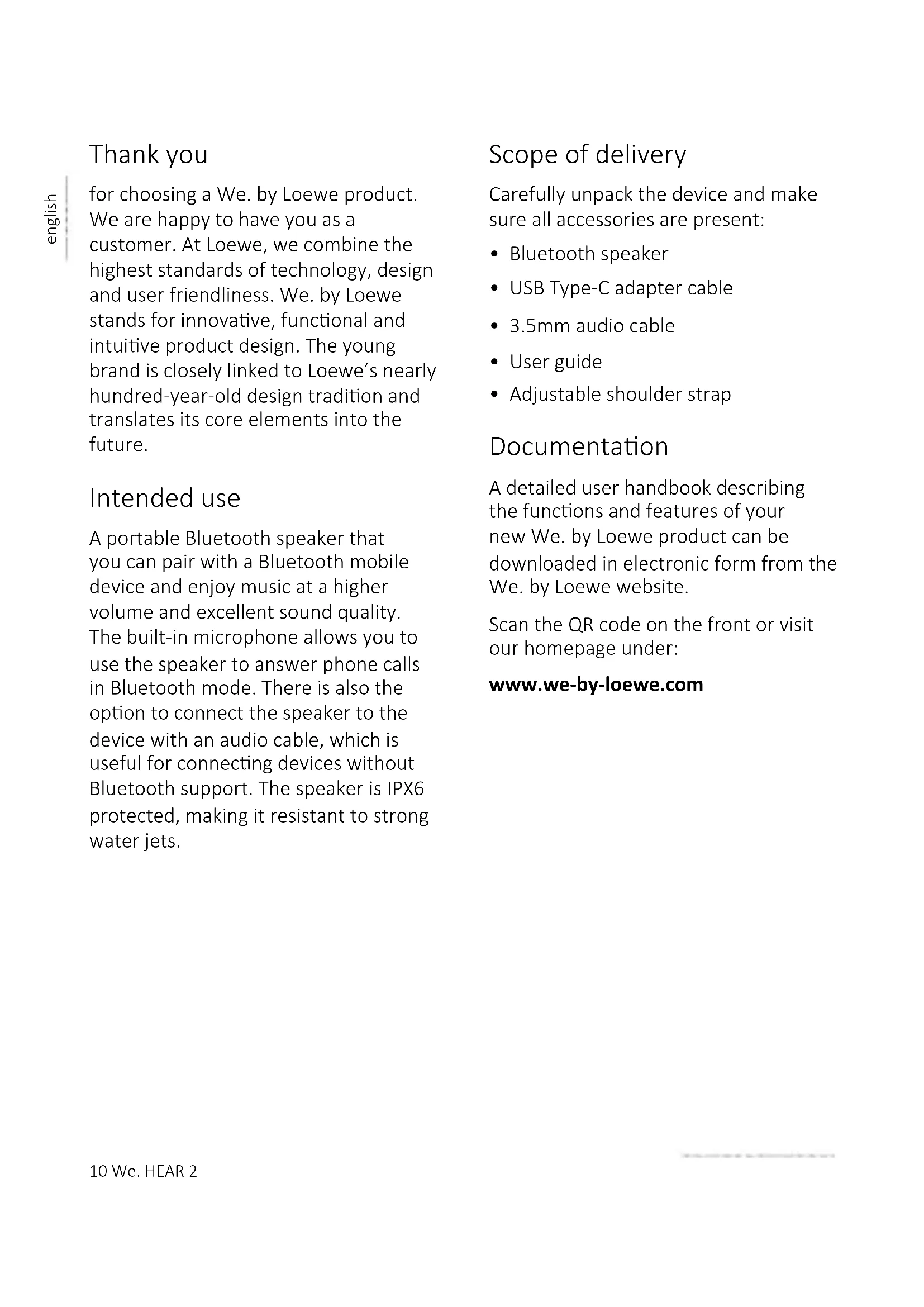 - Adjustable shoulder strap Documentaon A detailed user handbook describing the funcons and features of your new We. by Loewe product can be downloaded in electronic form from the We. by Loewe website. Scan the QR code on the front or visit our homepage under: www.we-by-loewe.comWe. HEAR 2 11 english 1 Important safety instrucons Aenon: Read this page carefully to ensure safe operaon of the device. Explanaon of symbols This symbol indicates risks caused by high voltages. This symbol is to alert the user to other, more specic risks. This symbol indicates dangers caused by the development of re.