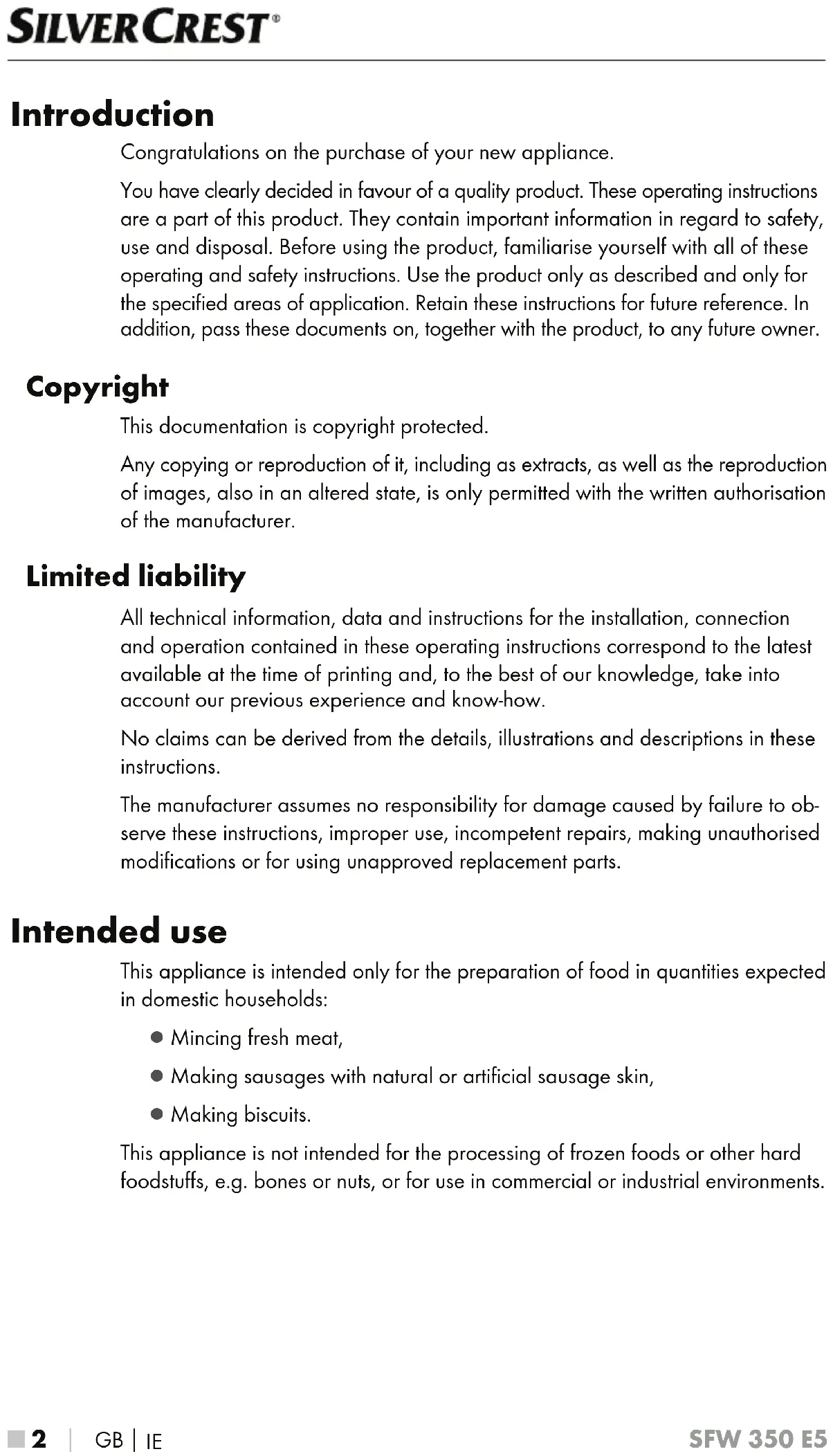 SFW 350 E5 Introduction Congratulations on the purchase of your new appliance. You have clearly decided in favour of a quality product. These operating instructions are a part of this product. They contain important information in regard to safety, use and disposal. Before using the product, familiarise yourself with all of these operating and safety instructions. Use the product only as described and only for the specified areas of application. Retain these instructions for future reference. In addition, pass these documents on, together with the product, to any future owner. Copyright This documentation is copyright protected. Any copying or reproduction of it, including as extracts, as well as the reproduction of images, also in an altered state, is only permitted with the written authorisation of the manufacturer. Limited liability All technical information, data and instructions for the installation, connection and operation contained in these operating instructions correspond to the latest available at the time of printing and, to the best of our knowledge, take into account our previous experience and know-how. No claims can be derived from the details, illustrations and descriptions in these instructions. The manufacturer assumes no responsibility for damage caused by failure to ob- serve these instructions, improper use, incompetent repairs, making unauthorised modifications or for using unapproved replacement parts. Intended use This appliance is intended only for the preparation of food in quantities expected in domestic households: ▯ Mincing fresh meat, ▯ Making sausages with natural or artificial sausage skin, ▯ Making biscuits. This appliance is not intended for the processing of frozen foods or other hard foodstuffs, e.g. bones or nuts, or for use in commercial or industrial environments.GB
