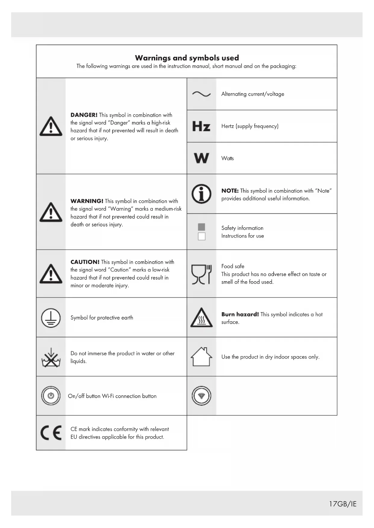 WARNING! Risk of electric shock! Do not set up the product next to a sink or in moist areas. Before connecting the product to the mains supply, check that the voltage and current rating correspond with the mains supply details shown on the product’s rating label. Only connect the product to a grounded mains supply. Make sure the mains plug is connected properly. To avoid damaging the supply cord, do not squeeze, bend or run it over sharp edges. Keep it away from hot surfaces and open flames as well. If the supply cord is damaged, it must be replaced by the manufacturer, its service agent or similarly qualified persons in order to avoid a hazard. Pull the plug and not the cable itself to disconnect the product from the mains supply. Connect the product to an easily reachable electrical outlet so that in case of an emergency the product can be unplugged immediately. The product must not be placed directly below a power supply.23GB/IE This product is not intended to be operated by means of an external timer or separate remote-control system. Do not operate or touch the product with wet hands.