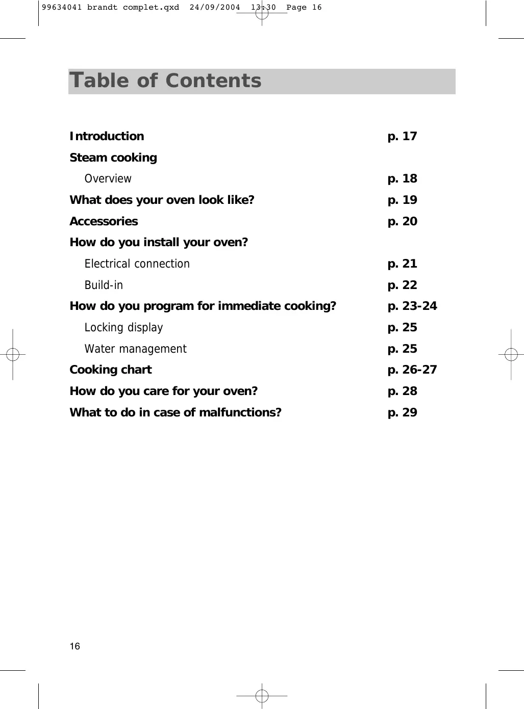 99634041 brandt complet.qxd 24/09/2004 13:30 Page 16 T able of Contents Introduction p. 17 Steam cooking Overview p. 18 What does your oven look like? p. 19 Accessories p. 20 How do you install your oven? Electrical connection p. 21 Build-in p. 22 How do you program for immediate cooking? p. 23-24 Locking display p. 25 Water management p. 25 Cooking chart p. 26-27 How do you care for your oven? p. 28 What to do in case of malfunctions? p. 29