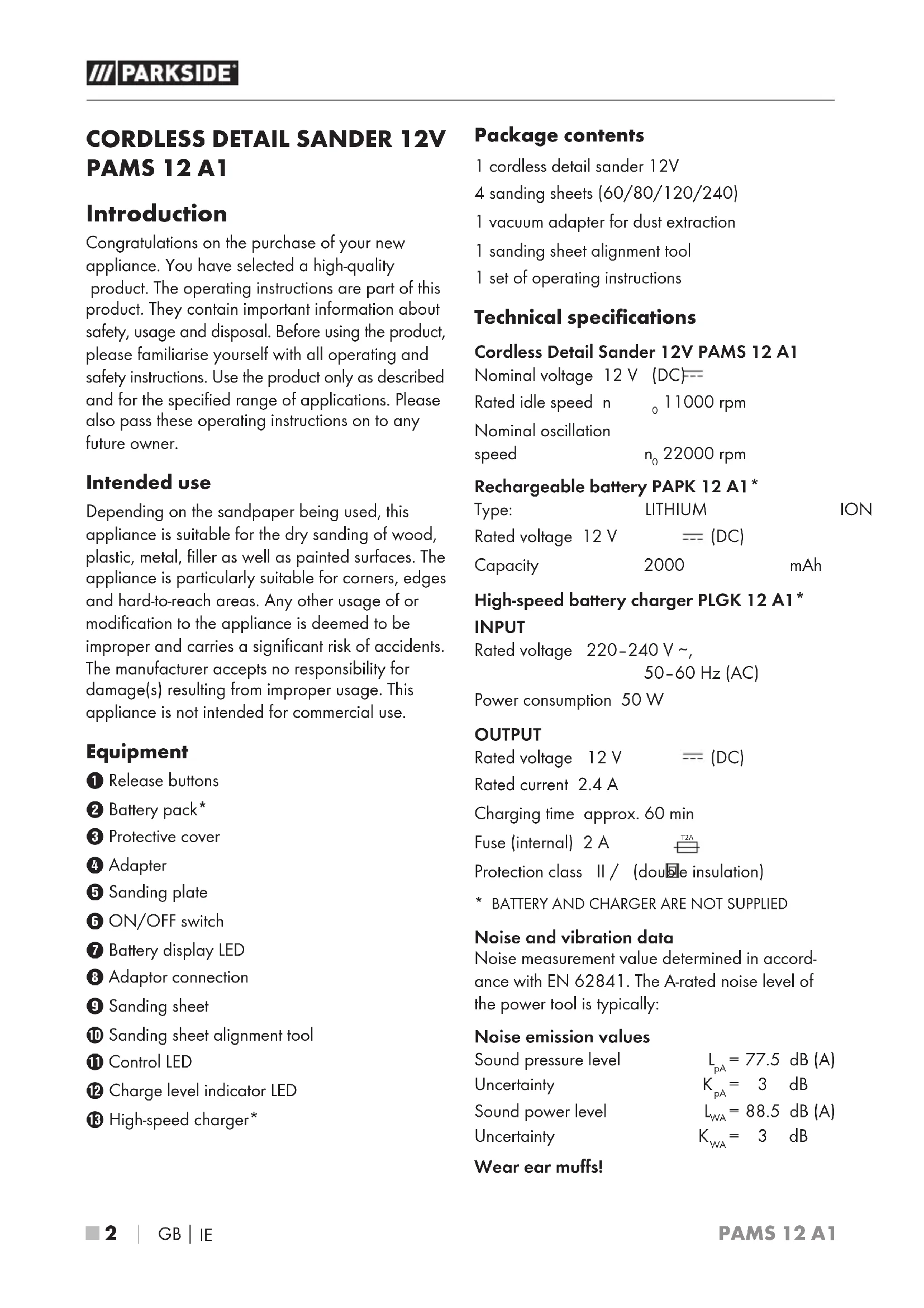 PAMS 12 A1 Introduction Congratulations on the purchase of your new appliance. You have selected a high-quality product. The operating instructions are part of this product. They contain important information about safety, usage and disposal. Before using the product, please familiarise yourself with all operating and safety instructions. Use the product only as described and for the specified range of applications. Please also pass these operating instructions on to any future owner. Intended use Depending on the sandpaper being used, this appliance is suitable for the dry sanding of wood, plastic, metal, filler as well as painted surfaces. The appliance is particularly suitable for corners, edges and hard-to-reach areas. Any other usage of or modification to the appliance is deemed to be improper and carries a significant risk of accidents. The manufacturer accepts no responsibility for damage(s) resulting from improper usage. This appliance is not intended for commercial use. Equipment 1 Release buttons 2 Battery pack* 3 Protective cover 4 Adapter 5 Sanding plate 6 ON/OFF switch 7 Battery display LED 8 Adaptor connection 9 Sanding sheet 0 Sanding sheet alignment tool q Control LED w Charge level indicator LED e High-speed charger* Package contents 1 cordless detail sander 12V 4 sanding sheets (60/80/120/240) 1 vacuum adapter for dust extraction 1 sanding sheet alignment tool 1 set of operating instructions Technical specifications Cordless Detail Sander 12V PAMS 12 A1 Nominal voltage 12 V (DC) Rated idle speed n