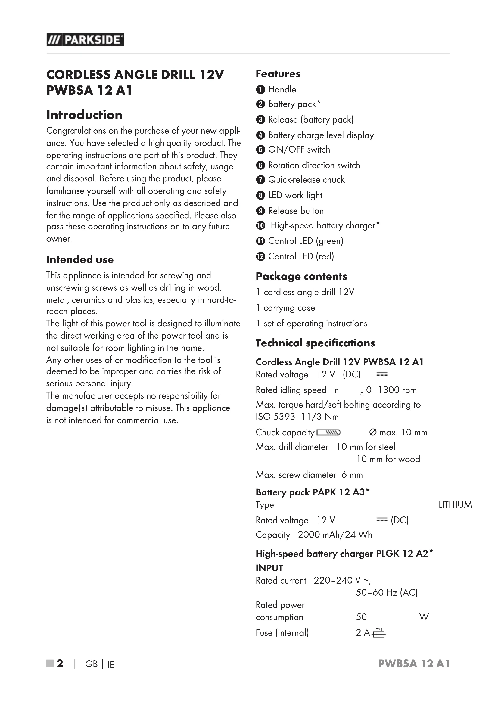PWBSA 12 A1 Introduction Congratulations on the purchase of your new appli- ance. You have selected a high-quality product. The operating instructions are part of this product. They contain important information about safety, usage and disposal. Before using the product, please familiarise yourself with all operating and safety instructions. Use the product only as described and for the range of applications specified. Please also pass these operating instructions on to any future owner. Intended use This appliance is intended for screwing and unscrewing screws as well as drilling in wood, metal, ceramics and plastics, especially in hard-to- reach places. The light of this power tool is designed to illuminate the direct working area of the power tool and is not suitable for room lighting in the home. Any other uses of or modification to the tool is deemed to be improper and carries the risk of serious personal injury. The manufacturer accepts no responsibility for damage(s) attributable to misuse. This appliance is not intended for commercial use. Features 1 Handle 2 Battery pack* 3 Release (battery pack) 4 Battery charge level display 5 ON/OFF switch 6 Rotation direction switch 7 Quick-release chuck 8 LED work light 9 Release button 0 High-speed battery charger* q Control LED (green) w Control LED (red) Package contents 1 cordless angle drill 12V 1 carrying case 1 set of operating instructions Technical specifications Cordless Angle Drill 12V PWBSA 12 A1 Rated voltage 12 V (DC) Rated idling speed n