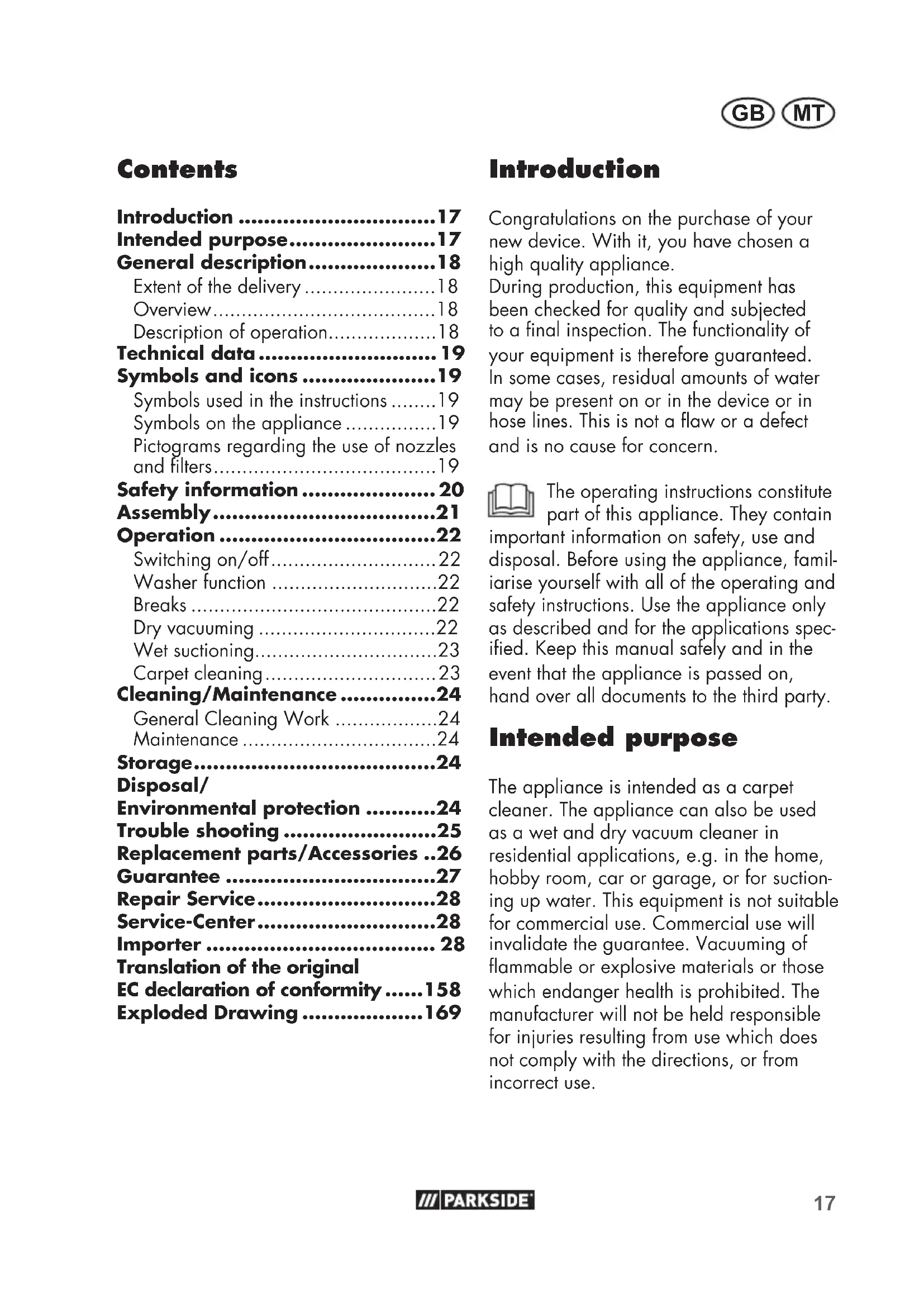 - Introduction Congratulations on the purchase of your new device. With it, you have chosen a high quality appliance. During production, this equipment has been checked for quality and subjected to a nal inspection. The functionality of your equipment is therefore guaranteed. In some cases, residual amounts of water may be present on or in the device or in hose lines. This is not a aw or a defect and is no cause for concern. The operating instructions constitute part of this appliance. They contain important information on safety, use and disposal. Before using the appliance, famil- iarise yourself with all of the operating and safety instructions. Use the appliance only as described and for the applications spec- ied. Keep this manual safely and in the event that the appliance is passed on, hand over all documents to the third party. Intended purpose The appliance is intended as a carpet cleaner. The appliance can also be used as a wet and dry vacuum cleaner in residential applications, e.g. in the home, hobby room, car or garage, or for suction- ing up water. This equipment is not suitable for commercial use. Commercial use will invalidate the guarantee. Vacuuming of ammable or explosive materials or those which endanger health is prohibited. The manufacturer will not be held responsible for injuries resulting from use which does not comply with the directions, or from incorrect use. Translation of the original EC declaration of conformity p. 158