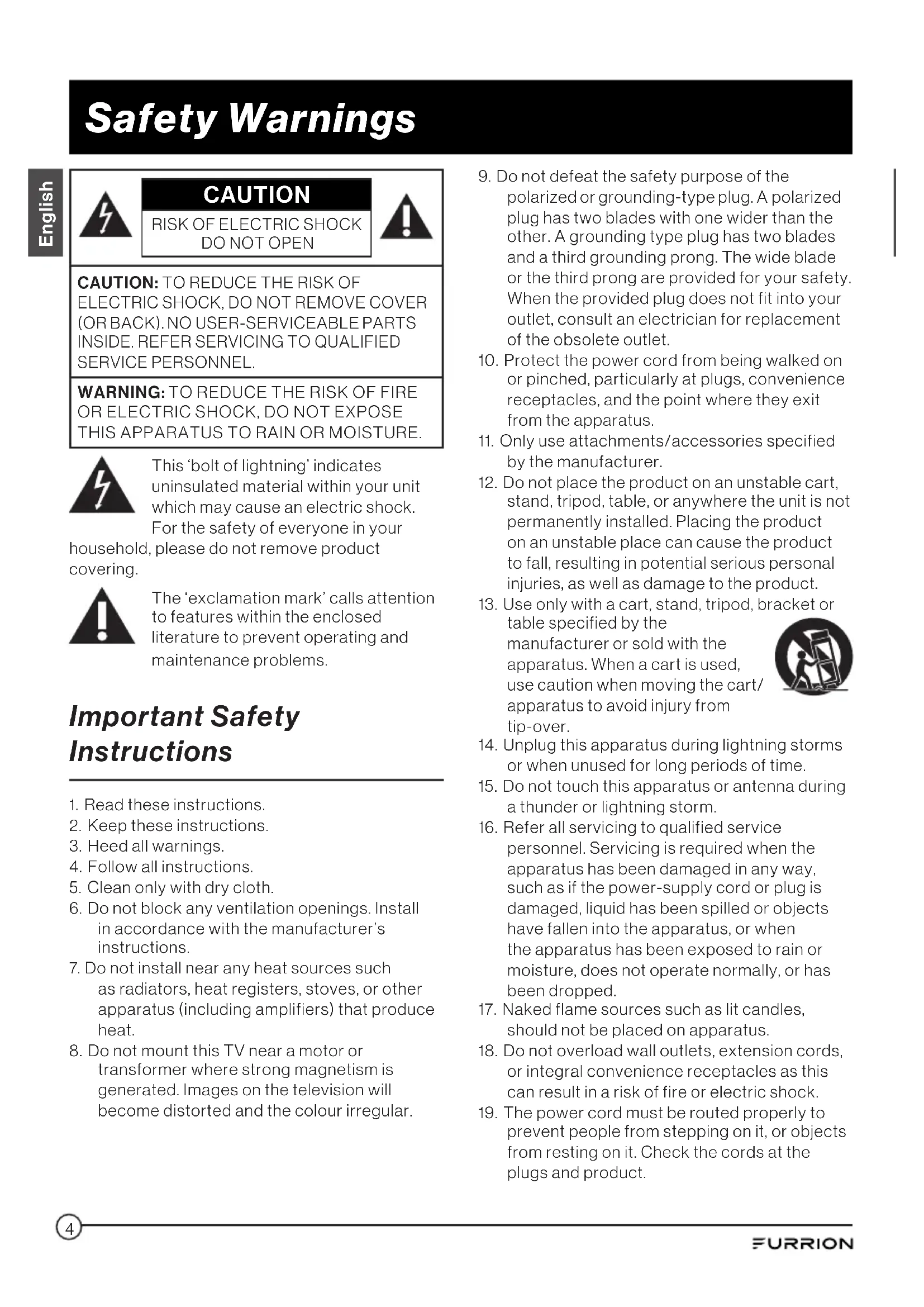 this can expose you to very high voltages and other hazards. If the TV does not operate properly, unplug the TV and call your authorized dealer or service center. Adjust only those controls that are covered in the instructions, as improper changes or modifications not expressly approved by Furrion could void the user’s warranty.