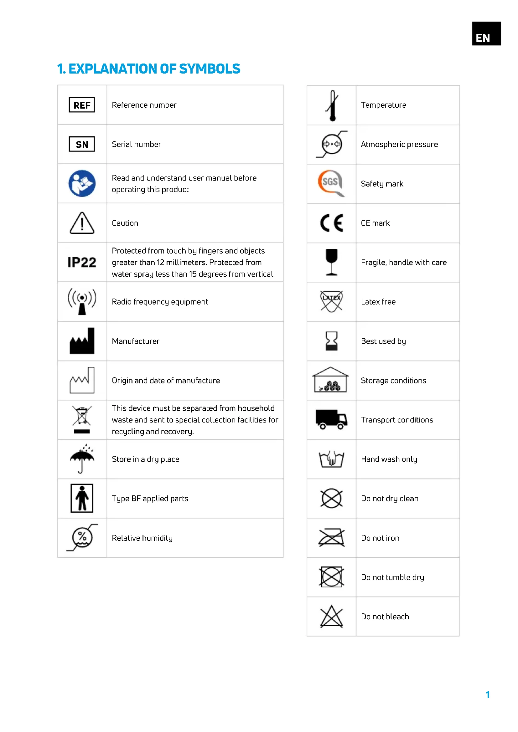 Serial number Read and understand user manual before operating this product Caution Protected from touch by fingers and objects greater than 12 millimeters. Protected from water spray less than 15 degrees from vertical. Radio frequency equipment Manufacturer Origin and date of manufacture This device must be separated from household waste and sent to special collection facilities for recycling and recovery. Store in a dry place Type BF applied parts Relative humidity Temperature Atmospheric pressure Safety mark CE mark Fragile, handle with care Latex free Best used by Storage conditions Transport conditions Hand wash only Do not dry clean Do not iron Do not tumble dry Do not bleach2