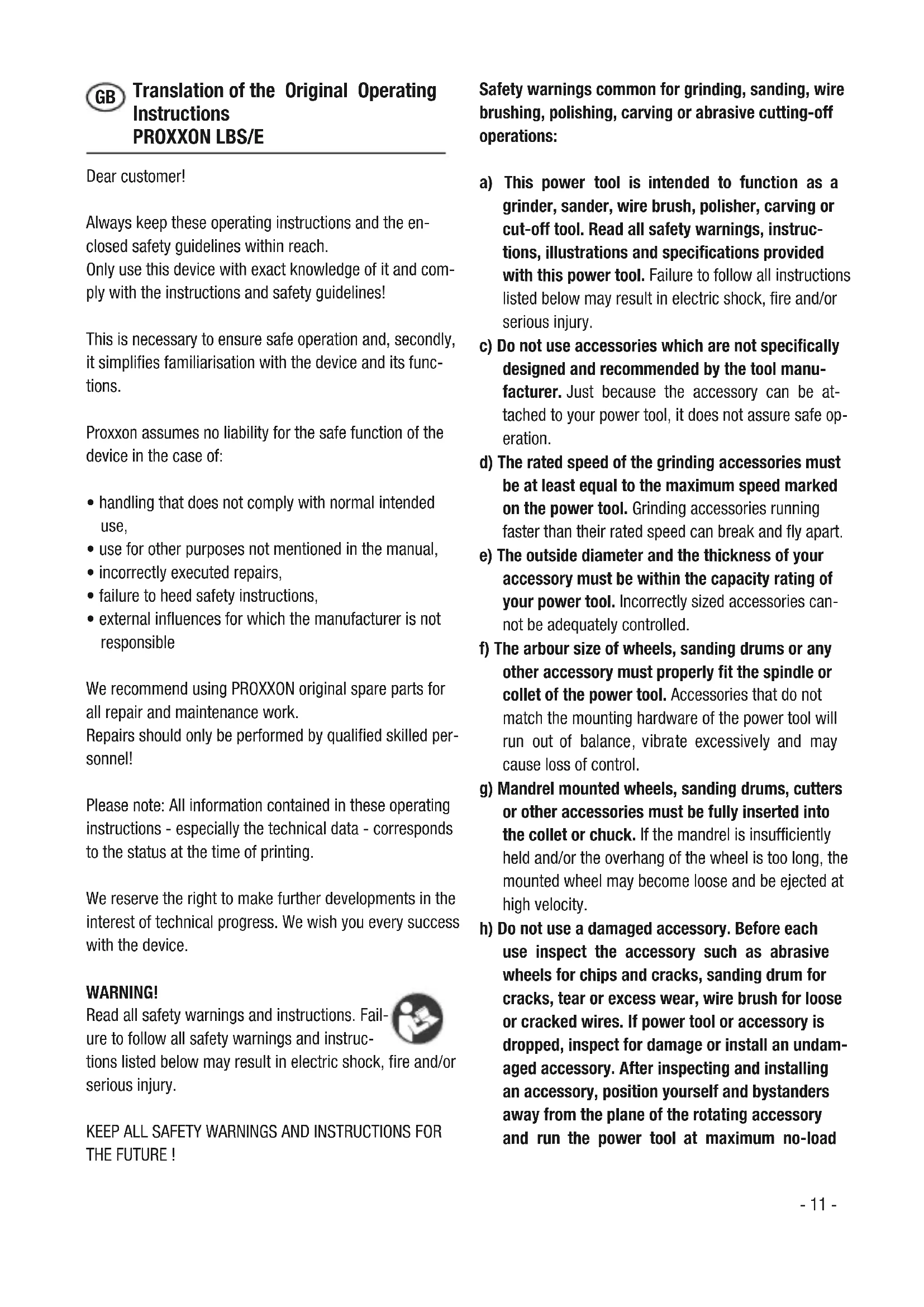 when combining your professional grinder LBS/E with other machines and devices! Maintenance, cleaning and care Attention: Disconnect the mains plug prior to every adjustment, maintenance measure or repair! Note: Every device is dirtied by dust when working. Cleaning is therefore essential. To ensure a long service life, how- ever, the machine should be cleaned with a soft cloth or brush after each use. Mild soap or other suitable cleaning agent may be used in this context. Solvents or cleaning agents containing al- cohol (e.g. petrol, cleaning alcohols, etc.) should be avoided, since these can attack plastic casings. The apertures required for cooling the motor must always be kept free of dust and dirt.- 16 - Accessories For more detailed information on accessories, please re- quest our device catalogue from the address specified on the last page in the warranty information. Please note in general: Proxxon bits and cutters have been designed to work with our machines, which makes them optimal for their use. We will not assume any liability whatsoever for the safe and proper function of our devices when using third-party bits and cutters! Service note Please note: The mains power input may only be replaced by our Proxxon Service Department or a qualified spe- cialist! Disposal Please do not dispose of the device in domestic waste! The device contains valuable substances that can be re- cycled. If you have any questions about this, please con- tact your local waste management enterprise or other corresponding municipal facilities.