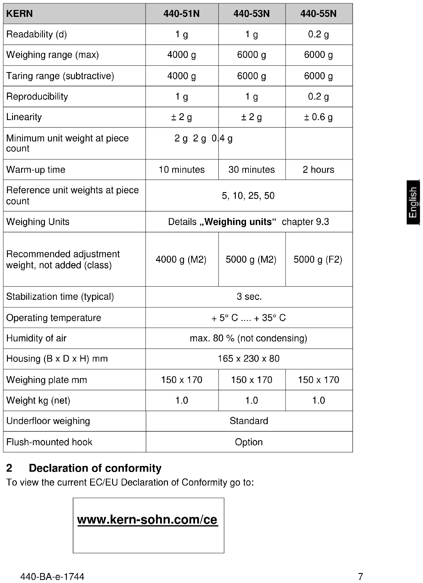 KERN 440-51N 440-53N 440-55N Readability (d) 1 g 1 g 0.2 g Weighing range (max) 4000 g 6000 g 6000 g Taring range (subtractive) 4000 g 6000 g 6000 g Reproducibility 1 g 1 g 0.2 g Linearity ± 2 g ± 2 g ± 0.6 g Minimum unit weight at piece count 2 g 2 g 0.4 g Warm-up time 10 minutes 30 minutes 2 hours Reference unit weights at piece count 5, 10, 25, 50 Weighing Units Details „Weighing units“ chapter 9.3 Recommended adjustment weight, not added (class) 4000 g (M2) 5000 g (M2) 5000 g (F2) Stabilization time (typical) 3 sec. Operating temperature + 5° C .... + 35° C Humidity of air max. 80 % (not condensing) Housing (B x D x H) mm 165 x 230 x 80 Weighing plate mm 150 x 170 150 x 170 150 x 170 Weight kg (net) 1.0 1.0 1.0 Underfloor weighing Standard Flush-mounted hook Option 2 Declaration of conformity To view the current EC/EU Declaration of Conformity go to: www.kern-sohn.com/ce440-BA-e-1744