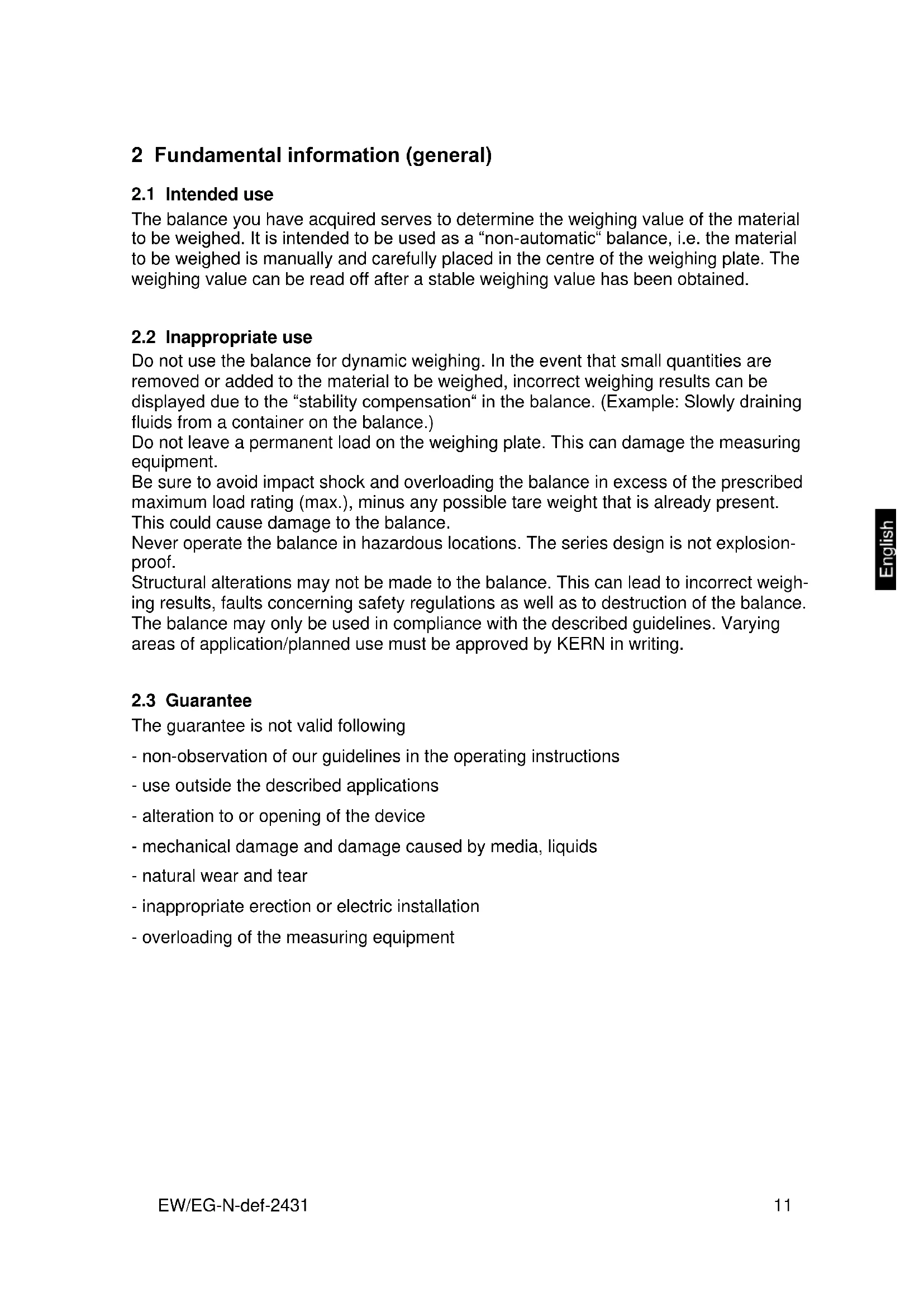 The metrology features of the balance and any possible available adjusting weight must be checked at regular intervals within the scope of quality assurance. For this purpose, the answerable user must define a suitable interval as well as the nature and scope of this check. Information is available on KERN’s home page (www.kern- sohn.com) with regard to the monitoring of balance test substances and the test weights required for this. Test weights and balances can be adjusted quickly and at a reasonable price in KERN’s accredited DKD calibration laboratory (return to national normal). 3 Fundamental safety information