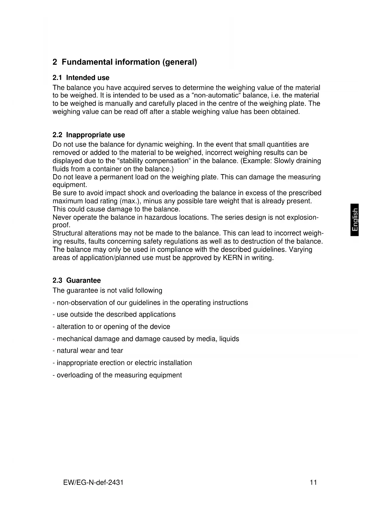 Do not use the balance for dynamic weighing. In the event that small quantities are removed or added to the material to be weighed, incorrect weighing results can be displayed due to the “stability compensation“ in the balance. (Example: Slowly draining fluids from a container on the balance.) Do not leave a permanent load on the weighing plate. This can damage the measuring equipment. Be sure to avoid impact shock and overloading the balance in excess of the prescribed maximum load rating (max.), minus any possible tare weight that is already present. This could cause damage to the balance. Never operate the balance in hazardous locations. The series design is not explosion- proof. Structural alterations may not be made to the balance. This can lead to incorrect weigh- ing results, faults concerning safety regulations as well as to destruction of the balance. The balance may only be used in compliance with the described guidelines. Varying areas of application/planned use must be approved by KERN in writing.