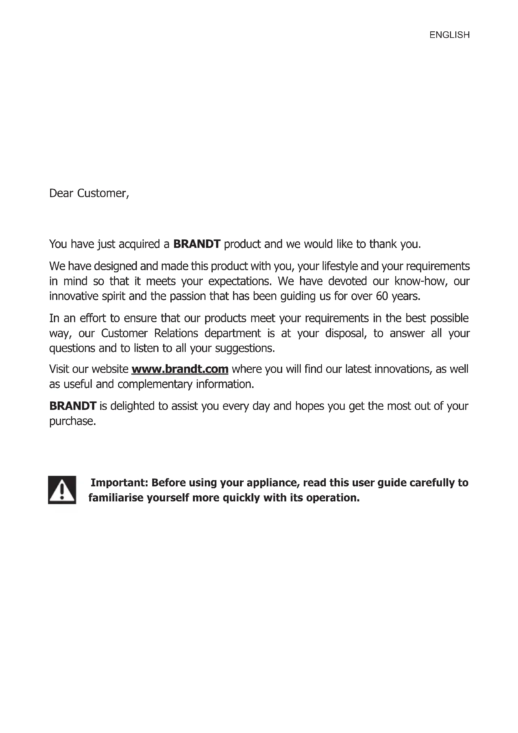 Dear Customer, You have just acquired a BRANDT product and we would like to thank you. We have designed and made this product with you, your lifestyle and your requirements in mind so that it meets your expectations. We have devoted our know-how, our innovative spirit and the passion that has been guiding us for over 60 years. In an effort to ensure that our products meet your requirements in the best possible way, our Customer Relations department is at your disposal, to answer all your questions and to listen to all your suggestions. Visit our website www.brandt.com where you will find our latest innovations, as well as useful and complementary information. BRANDT is delighted to assist you every day and hopes you get the most out of your purchase. Important: Before using your appliance, read this user guide carefully to familiarise yourself more quickly with its operation.ENGLISH Important: When you receive the appli- ance, unpack it immediately. Give it an overall inspection. Make note of any concerns or reservations on the delivery slip and make sure to keep a copy of this form. Before starting your appliance, please read this installation guide carefully to familiarise yourself quickly with its operation. Keep this user guide with your appliance. If the appliance is ever sold or trans- ferred to another person, ensure that the new owner receives this user guide. Please become familiar with these recommendations before installing and using your oven. They were written for your safe- ty and the safety of others. — This oven was designed for use by private persons in their homes. This oven does not con- tain any asbestos-based compo- nents. — Your appliance is intended for standard household use. Do not use it for commercial or industri- al purposes or for any other purpose than that for which it was designed. — Do not modify or attempt to modify any of the characteristics of this appliance. This would be dangerous to your safety. — Never place tin foil directly in contact with the oven floor as the build up of heat may dam- age the enamel. — Do not place heavy weights on the open oven door, and make sure that children are able neither to climb nor sit on it. — Do not use your oven as a larder or to store any items after use. — After using your oven, make sure that all the controls are in their stop position. — The oven must be turned off when cleaning inside the oven. — Before removing the glass window, allow the appliance to cool down. This appliance may be used by children aged 8 years and older, and by persons with impaired physical sensorial or mental capacities, or without experience or knowledge, if they are supervised or have received prior instructions on how to use the appliance safely and have understood the risks involved. Children must not be allowed to play with the appli- ance. Cleaning and mainte- nance operations must not be carried out by children without supervision. — Children must be supervised to prevent them from playing with the appliance. SAFETY INSTRUCTIONS