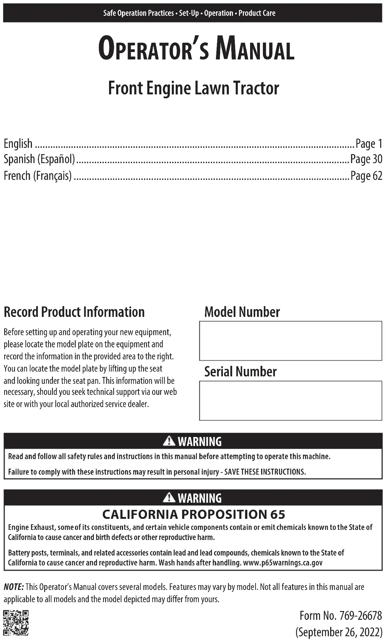 OperatOr’s Manual Front Engine Lawn Tractor NOTE: This Operator’s Manual covers several models. Features may vary by model. Not all features in this manual are applicable to all models and the model depicted may differ from yours. English ............................................................................................................................Page 1 Spanish (Español) ..........................................................................................................Page 30 French (Français) ...........................................................................................................Page 62 Form No. 769-26678 (September 26, 2022) Record Product Information Before setting up and operating your new equipment, please locate the model plate on the equipment and record the information in the provided area to the right. You can locate the model plate by lifting up the seat and looking under the seat pan. This information will be necessary, should you seek technical support via our web site or with your local authorized service dealer. Model Number Serial Number WARNING Read and follow all safety rules and instructions in this manual before attempting to operate this machine. Failure to comply with these instructions may result in personal injury - SAVE THESE INSTRUCTIONS. WARNING CALIFORNIA PROPOSITION 65 Engine Exhaust, some of its constituents, and certain vehicle components contain or emit chemicals known to the State of California to cause cancer and birth defects or other reproductive harm.Battery posts, terminals, and related accessories contain lead and lead compounds, chemicals known to the State of California to cause cancer and reproductive harm. Wash hands after handling. www.p65warnings.ca.govSafe Operation Practices • Set-Up • Operation • Product Care2