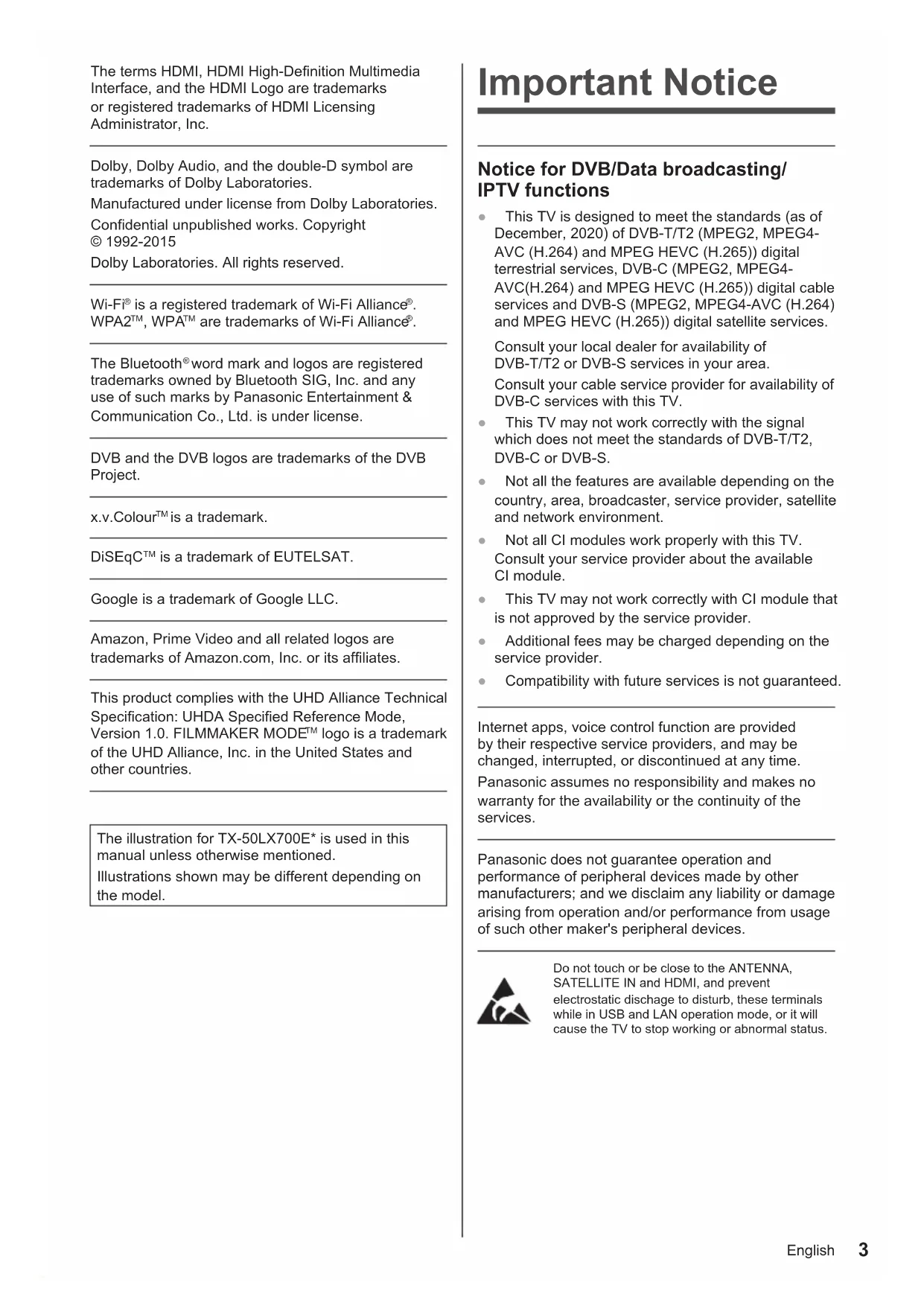 logo is a trademark of the UHD Alliance, Inc. in the United States and other countries. The illustration for TX-50LX700E* is used in this manual unless otherwise mentioned. Illustrations shown may be different depending on the model. Important Notice Notice for DVB/Data broadcasting/ IPTV functions ● This TV is designed to meet the standards (as of December, 2020) of DVB-T/T2 (MPEG2, MPEG4- AVC (H.264) and MPEG HEVC (H.265)) digital terrestrial services, DVB-C (MPEG2, MPEG4- AVC(H.264) and MPEG HEVC (H.265)) digital cable services and DVB-S (MPEG2, MPEG4-AVC (H.264) and MPEG HEVC (H.265)) digital satellite services. Consult your local dealer for availability of DVB-T/T2 or DVB-S services in your area. Consult your cable service provider for availability of DVB-C services with this TV. ● This TV may not work correctly with the signal which does not meet the standards of DVB-T/T2, DVB-C or DVB-S. ● Not all the features are available depending on the country, area, broadcaster, service provider, satellite and network environment. ● Not all CI modules work properly with this TV. Consult your service provider about the available CI module. ● This TV may not work correctly with CI module that is not approved by the service provider. ● Additional fees may be charged depending on the service provider. ● Compatibility with future services is not guaranteed. Internet apps, voice control function are provided by their respective service providers, and may be changed, interrupted, or discontinued at any time. Panasonic assumes no responsibility and makes no warranty for the availability or the continuity of the services. Panasonic does not guarantee operation and performance of peripheral devices made by other manufacturers; and we disclaim any liability or damage arising from operation and/or performance from usage of such other maker's peripheral devices. Do not touch or be close to the ANTENNA, SATELLITE IN and HDMI, and prevent electrostatic dischage to disturb, these terminals while in USB and LAN operation mode, or it will cause the TV to stop working or abnormal status.English