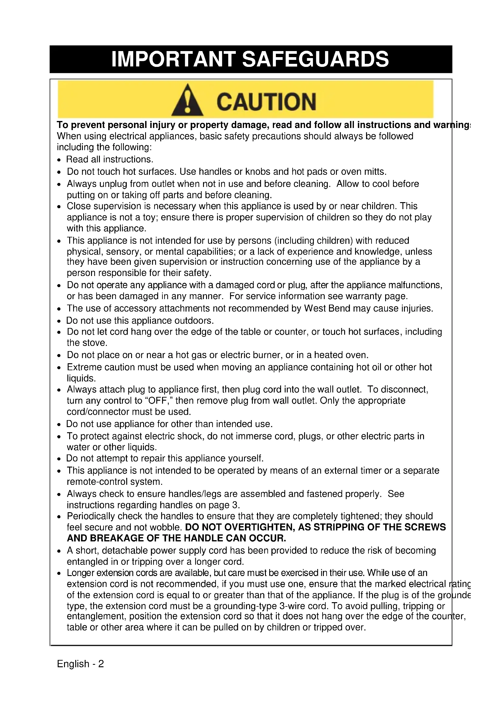 - The use of accessory attachments not recommended by West Bend may cause injuries.