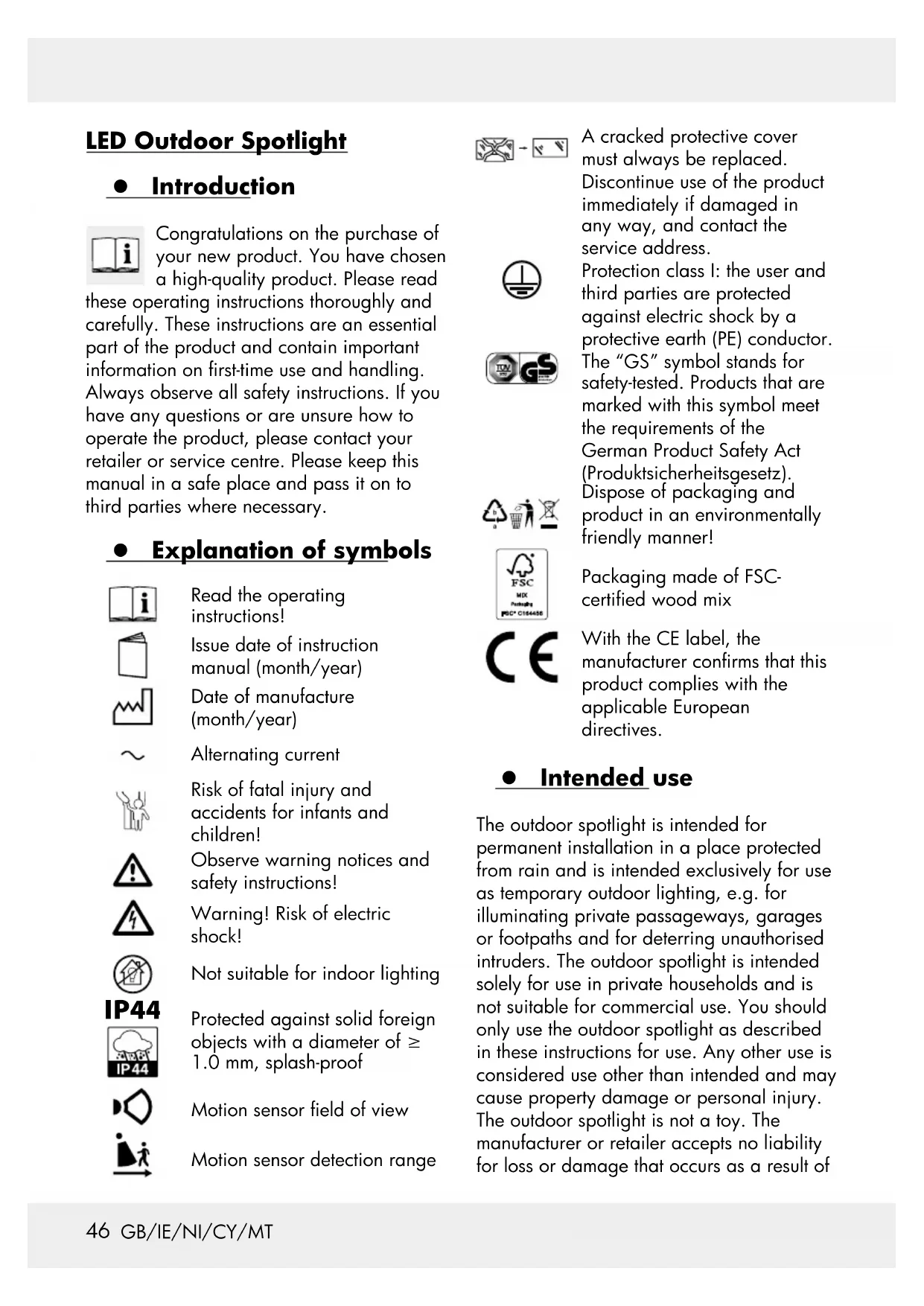 Motion sensor eld of view Motion sensor detection range A cracked protective cover must always be replaced. Discontinue use of the product immediately if damaged in any way, and contact the service address. Protection class I: the user and third parties are protected against electric shock by a protective earth (PE) conductor. The “GS” symbol stands for safety-tested. Products that are marked with this symbol meet the requirements of the German Product Safety Act (Produktsicherheitsgesetz). Dispose of packaging and product in an environmentally friendly manner! Packaging made of FSC- certied wood mix With the CE label, the manufacturer conrms that this product complies with the applicable European directives. z Intended use The outdoor spotlight is intended for permanent installation in a place protected from rain and is intended exclusively for use as temporary outdoor lighting, e.g. for illuminating private passageways, garages or footpaths and for deterring unauthorised intruders. The outdoor spotlight is intended solely for use in private households and is not suitable for commercial use. You should only use the outdoor spotlight as described in these instructions for use. Any other use is considered use other than intended and may cause property damage or personal injury. The outdoor spotlight is not a toy. The manufacturer or retailer accepts no liability for loss or damage that occurs as a result of47 GB/IE/NI/CY/MT use other than intended or incorrect use. This product uses a light source with a Class F energy efciency rating. z Specications supplied 1 LED outdoor spotlight 1 wall bracket (for mounting on building walls or corners) inc. xings (4 wall plugs, 2 screws (10mm), 4 screws (25mm)) 1 instruction manual z Description of parts