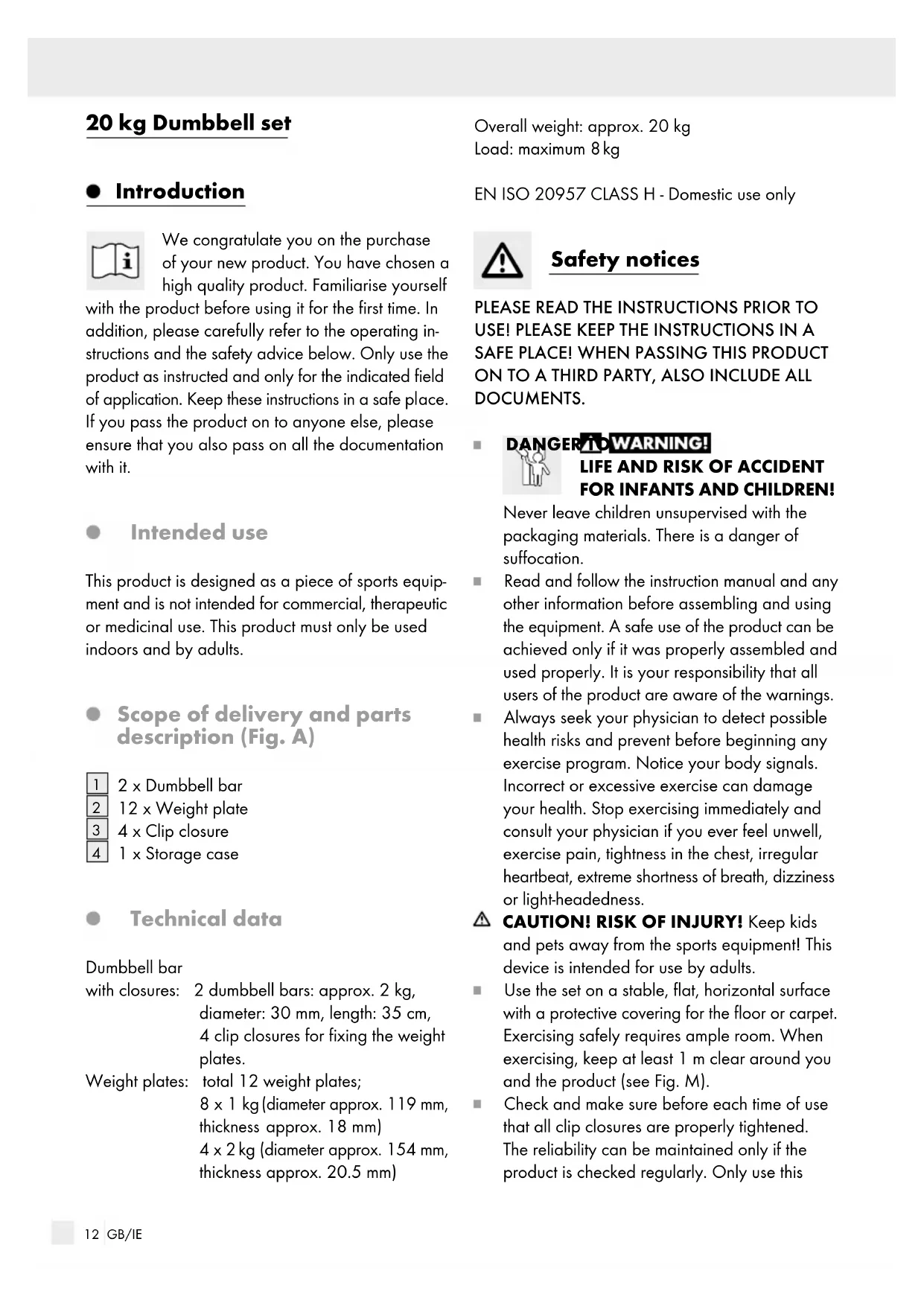 FOR INFANTS AND CHILDREN! Never leave children unsupervised with the packaging materials. There is a danger of suffocation. Read and follow the instruction manual and any other information before assembling and using the equipment. A safe use of the product can be achieved only if it was properly assembled and used properly. It is your responsibility that all users of the product are aware of the warnings. Always seek your physician to detect possible health risks and prevent before beginning any exercise program. Notice your body signals. Incorrect or excessive exercise can damage your health. Stop exercising immediately and consult your physician if you ever feel unwell, exercise pain, tightness in the chest, irregular heartbeat, extreme shortness of breath, dizziness or light-headedness. CAUTION! RISK OF INJURY! Keep kids and pets away from the sports equipment! This device is intended for use by adults. Use the set on a stable, flat, horizontal surface with a protective covering for the floor or carpet. Exercising safely requires ample room. When exercising, keep at least 1 m clear around you and the product (see Fig. M). Check and make sure before each time of use that all clip closures are properly tightened. The reliability can be maintained only if the product is checked regularly. Only use this13 GB/IE product in good condition. Do not use this product if damaged. The device is particularly suitable for training the upper body and arm muscles, and improves overall endurance and fat burning. Please note that the training equipment corre- sponds to EN ISO 20957 CLASS H (H = Home use). The maximum weight is 10 kg. Ac- cording to DIN EN ISO 20957-1, the training item is not suited for teenagers below 14 years of age. Parents and other supervisors should be aware of their responsibility, because due to the chil- dren’s natural play instinct and their joy at ex- perimenting they may get into situations and show behaviour for which the training equipm ent is not suitable. If you allow children to use the equipment you should take their mental and physical develop- ment and above all their liveliness into consid- eration. You should supervise the children and above all show them how to use the equipment correctly. Training equipment by no means is suitable as toy. Pay special attention to the condition of the plastic clip closure. These parts are the most susceptible to wear and tear. Assembly Insert the weight plates