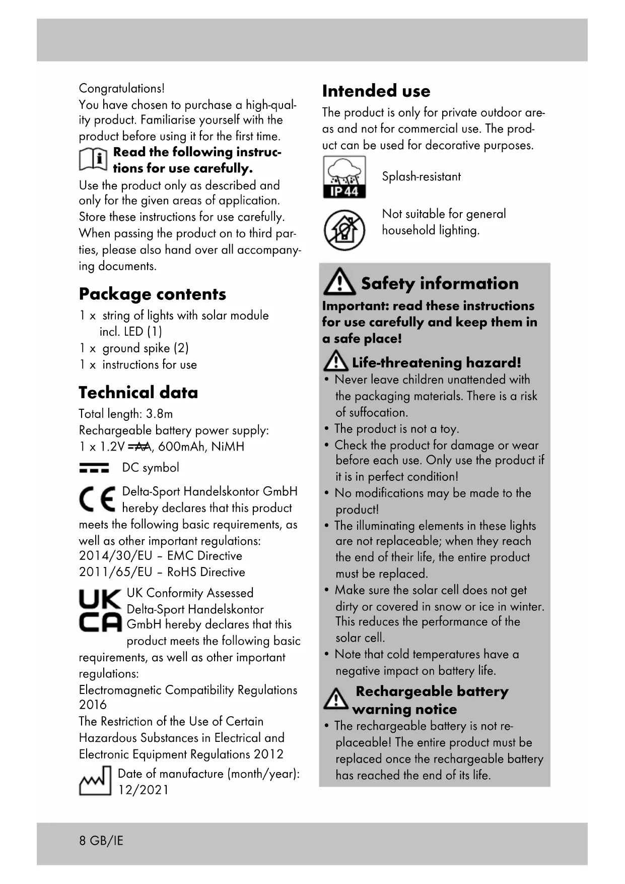 - Slide the on/off switch to the ‘OFF’ position. The product is permanently switched off. Storage, cleaning When not in use, always store the product switched off, dry and clean at room temperature. Only clean the exterior of the product with a damp cloth and wipe dry afterwards. IMPORTANT! Never clean the product with harsh cleaning agents. GB/IE10 GB/IE Disposal In the interest of protecting the environment, do not throw your product into the household waste once you are finished with it, but rather take it to a specialty disposal facility. Find out about collection sites and their hours of operation from your local authority. Defective or used batteries must be recy- cled pursuant to Directive 2006/66/EC and changes to it. Return batteries and/ or the product via the collecting sites pro- vided. Packaging materials, such as plastic bags, must be kept away from children. Keep the packaging materials out of reach of children. Environmental damage caused by improper disposal of batteries! Batteries may not be disposed of with household waste. They may contain toxic heavy metals and are subject to hazardous waste treatment. The chemical symbols of the heavy metals are as follows: Cd = cadmium, Hg = mercury, Pb = lead. Dispose of used batteries at a municipal collection site. Dispose of the product and packaging in an environmentally friendly manner. Note the label on the packaging materials when separating waste, as these are labelled with abbreviations (a) and numbers (b) with the following meaning: 1–7: plastics/20–22: paper and cardboard/80–98: composite materials. The product and the packaging materials can be recycled, dispose of them separate- ly for better treatment of waste. The Triman logo only applies to France. Find out how to dispose of the used product from your municipal or city administration. Notes on the guarantee and service handling The product was produced with great care and under continuous quality control. DELTA-SPORT HANDELSKONTOR GmbH gives private end customers a three-year guarantee on this product from the date of purchase (guarantee period) in accord- ance with the following provisions. The guarantee is only valid for material and manufacturing defects. The guarantee does not cover parts subject to normal wear and tear that are thus considered wear parts (e.g. batteries) or fragile parts such as switches, rechargeable batteries, or parts made of glass. Claims under this guarantee are excluded if the product has been used incorrectly, improperly, or contrary to the intended purpose, or if the provisions in the instruc- tions for use were not observed, unless the end customer proves that a material or manufacturing defect exists that was not caused by one of the aforementioned circumstances. Claims under the guarantee can only be made within the guarantee period by pre- senting the original sales receipt. Please therefore keep the original sales receipt. The guarantee period is not extended by any repairs carried out under the guaran- tee, under statutory guarantees, or as a gesture of goodwill. This also applies to replaced and repaired parts. If you wish to make a claim please first contact the service hotline mentioned below or contact us by e-mail. If there is a guarantee case, then the product will be repaired or replaced free of charge to you or the purchase price will be refunded, depending on our choice. Your legal rights, in particular guarantee claims against the respective seller, are not limited by this guarantee.11 IAN: 398838_2107 Service Great Britain Tel.: 0800 404 7657 E-Mail: deltasport@lidl.co.uk Service Ireland Tel.: 1890 930 034 (0,08 EUR/Min., (peak)) (0,06 EUR/Min., (off peak)) E-Mail: deltasport@lidl.ie GB/IE12 FR/BE Félicitations ! Vous venez d’acquérir un article de grande qualité. Avant la première utilisa- tion, familiarisez-vous avec l’article. Pour cela, veuillez lire attenti- vement la notice d’utilisation suivante. Utilisez l’article uniquement comme indiqué et pour les domaines d’utilisation mentionnés. Conservez bien cette notice d’utilisation. Si vous cédez l’article à un tiers, veillez à lui remettre l’ensemble de la documentation. Étendue de la livraison 1 guirlande lumineuse avec module solaire et LED (1) 1 piquet (2) 1 notice d’utilisation Caractéristiques techniques Longueur totale : 3,8 m Batterie d’alimentation : 1 x 1,2 V AA, 600 mAh, NiMH Symbole de tension continue Delta-Sport Handelskontor GmbH déclare par la présente que cet article répond aux exigences essentielles et aux autres dispositions en vigueur suivantes : 2014/30/UE – Directive européenne CEM 2011/65/UE – Directive RoHS Date de fabrication (mois/année) : 12/2021 Utilisation conforme à sa destination L’article est uniquement destiné à un usage domestique en extérieur et n’est pas prévu pour une utilisation commerciale. L’article est destiné à des fins décoratives. Protection contre les projections d’eau Ne convient pas pour l’éclairage général de pièces de la maison. Consignes de sécurité Important : lisez attentivement cette notice d’utilisation et conser- vez-la impérativement ! Danger de mort !