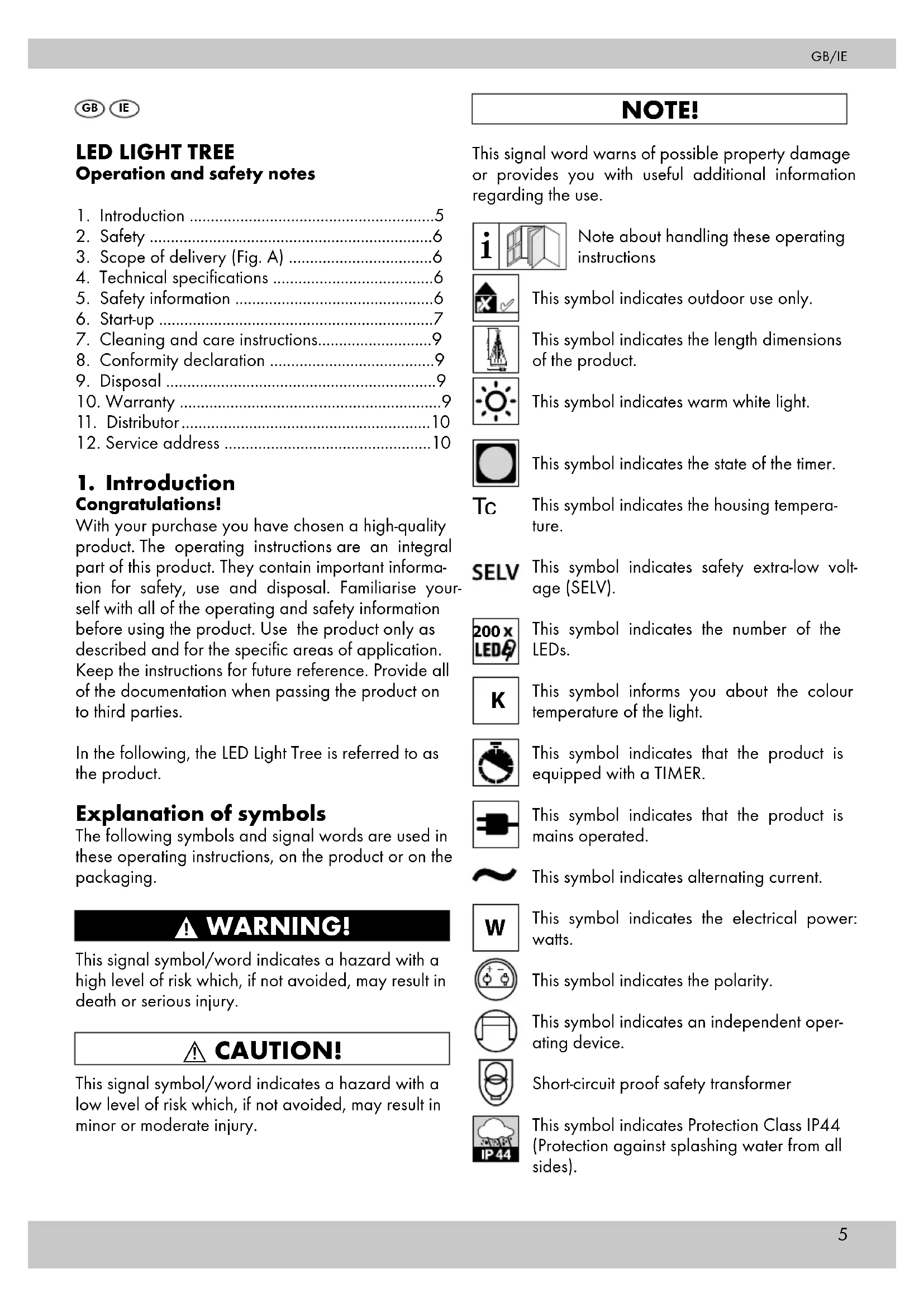 Congratulations! With your purchase you have chosen a high-quality product. The operating instructions are an integral part of this product. They contain important informa- tion for safety, use and disposal. Familiarise your- self with all of the operating and safety information before using the product. Use the product only as described and for the specific areas of application. Keep the instructions for future reference. Provide all of the documentation when passing the product on to third parties. In the following, the LED Light Tree is referred to as the product. Explanation of symbols The following symbols and signal words are used in these operating instructions, on the product or on the packaging.