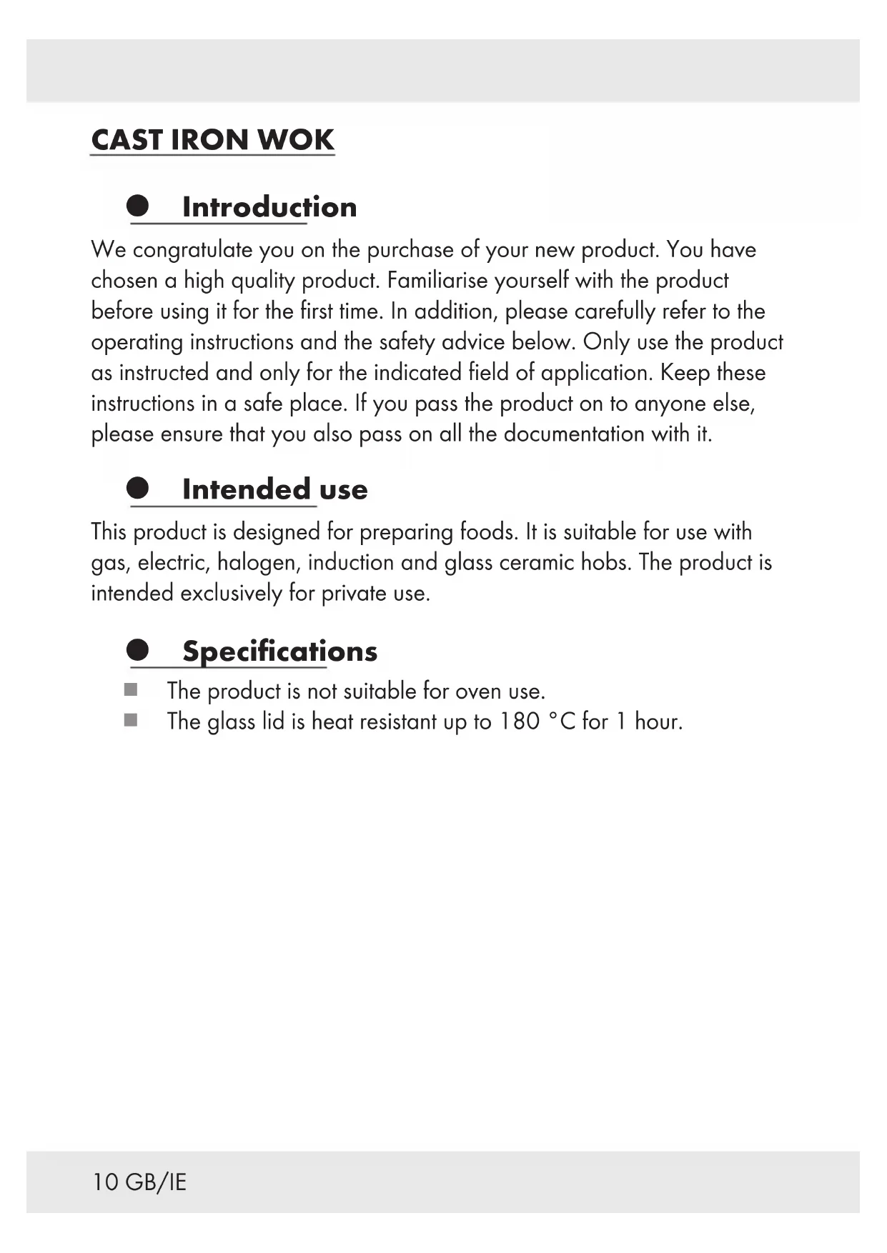 Introduction We congratulate you on the purchase of your new product. You have chosen a high quality product. Familiarise yourself with the product before using it for the first time. In addition, please carefully refer to the operating instructions and the safety advice below. Only use the product as instructed and only for the indicated field of application. Keep these instructions in a safe place. If you pass the product on to anyone else, please ensure that you also pass on all the documentation with it. Intended use This product is designed for preparing foods. It is suitable for use with gas, electric, halogen, induction and glass ceramic hobs. The product is intended exclusively for private use. Specifications The product is not suitable for oven use. The glass lid is heat resistant up to 180 °C for 1 hour.11GB/IE Safety instructions SAVE ALL SAFETY INSTRUCTIONS AND INSTRUCTIONS FOR USE FOR FUTURE REFERENCE!
