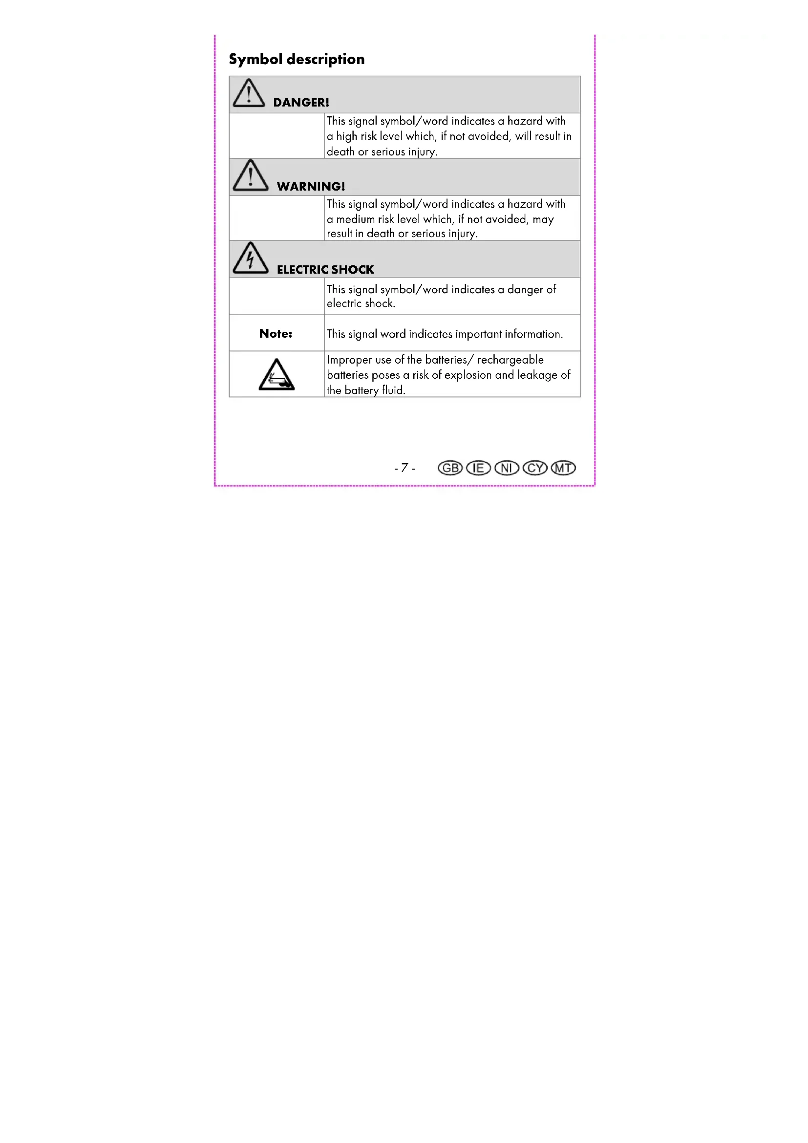 This device may be used by persons (including children over 8 years of age) with reduced physical, sensory or mental abilities or lack of experience and knowledge, if they are supervised or instructed regarding the safe use of the device and understand the dangers that may arise. Children may not play with the device. Cleaning and user maintenance of the device may not be performed by children without supervision. Keep packaging films out of the hands of children. There is a danger of suffocation.- 11 - Safety information for the batteries