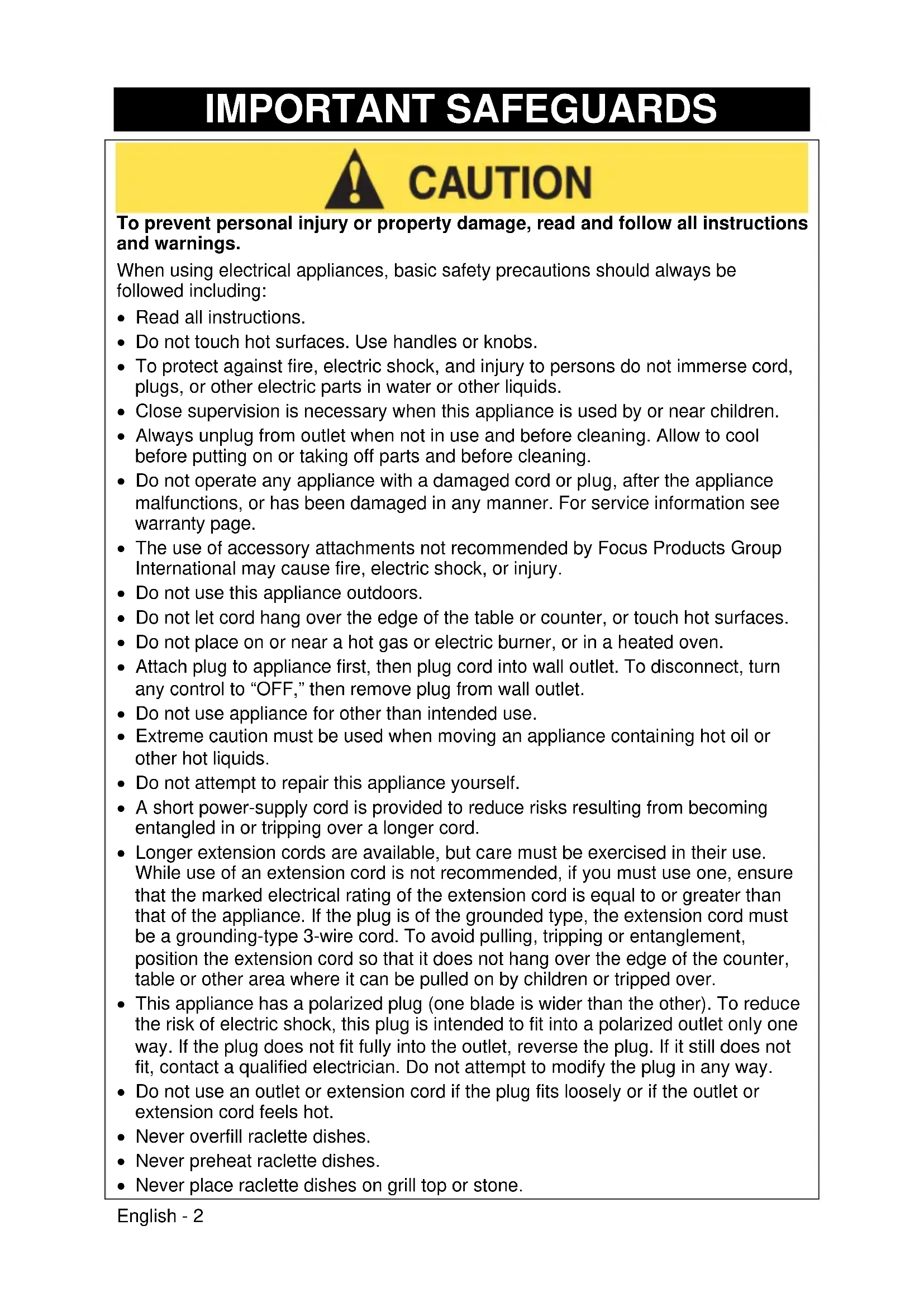 - The use of accessory attachments not recommended by Focus Products Group International may cause fire, electric shock, or injury.