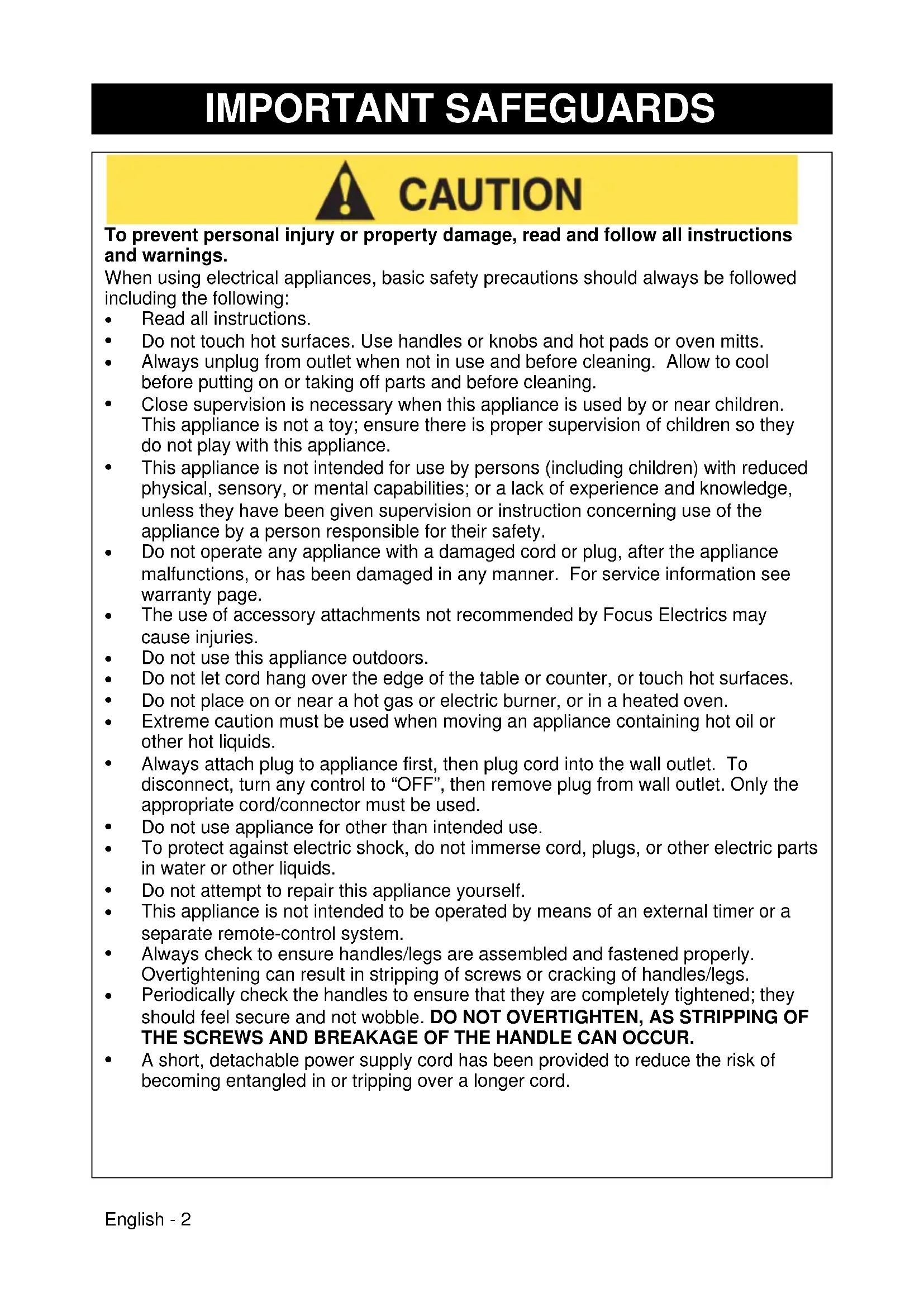 ARRANTY Appliance 1 Year Limited Warranty Focus Electrics, LLC (“Focus Electrics”) warrants this appliance from failures in the material and workmanship for one (1) year from the date of original purchase with proof of purchase, provided the appliance is operated and maintained in conformity with the provided Instruction Manual. Any failed part of the appliance will be repaired or replaced without charge at Focus Electrics’ discretion. This warranty applies to indoor household use only. This warranty does not cover any damage, including discoloration, to any non-stick surface of the appliance. This warranty is null and void, as determined solely by Focus Electrics if the appliance is damaged through accident, misuse, abuse, negligence, scratching, or if the appliance is altered in any way. THIS WARRANTY IS IN LIEU OF ALL IMPLIED WARRANTIES, INCLUDING WARRANTIES OF MERCHANTABILITY, FITNESS FOR A PARTICULAR PURPOSE, PERFORMANCE, OR OTHERWISE, WHICH ARE HEREBY EXCLUDED. IN NO EVENT SHALL FOCUS ELECTRICS BE LIABLE FOR ANY DAMAGES, WHETHER DIRECT, INDIRECT, INCIDENTAL, FORSEEABLE, CONSEQUENTIAL, OR SPECIAL, ARISING OUT OF OR IN CONNECTION WITH THIS APPLIANCE. If you think the appliance has failed or requires service within its warranty period, please contact the Focus Electrics Customer Service Department at (866) 290-1851, or e-mail us at service@focuselectrics.com. A receipt proving the original purchase date will be required for all warranty claims, hand written receipts are not accepted. You may also be required to return the appliance for inspection and evaluation. Return shipping costs are not refundable. Focus Electrics is not responsible for returns lost in transit. Valid only in USA and Canada