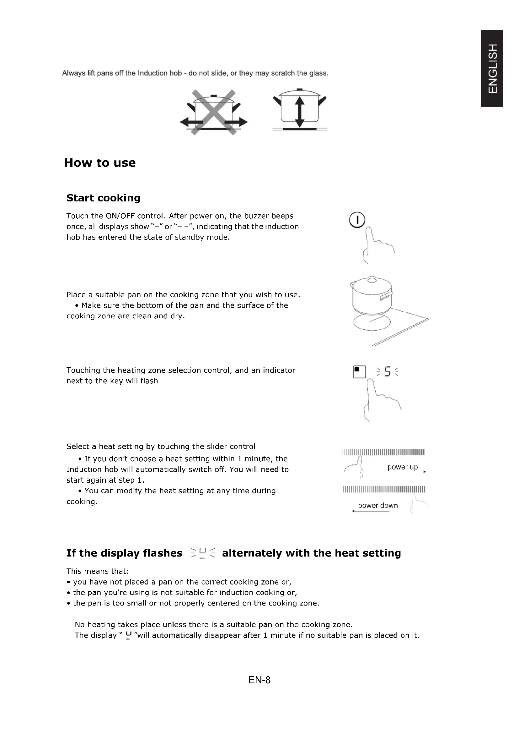 EN-6EN-7How to use Start cooking Touch the ON/OFF control. After power on, the buzzer beeps once, all displays show “–” or “– –”, indicating that the induction hob has entered the state of standby mode. Place a suitable pan on the cooking zone that you wish to use.