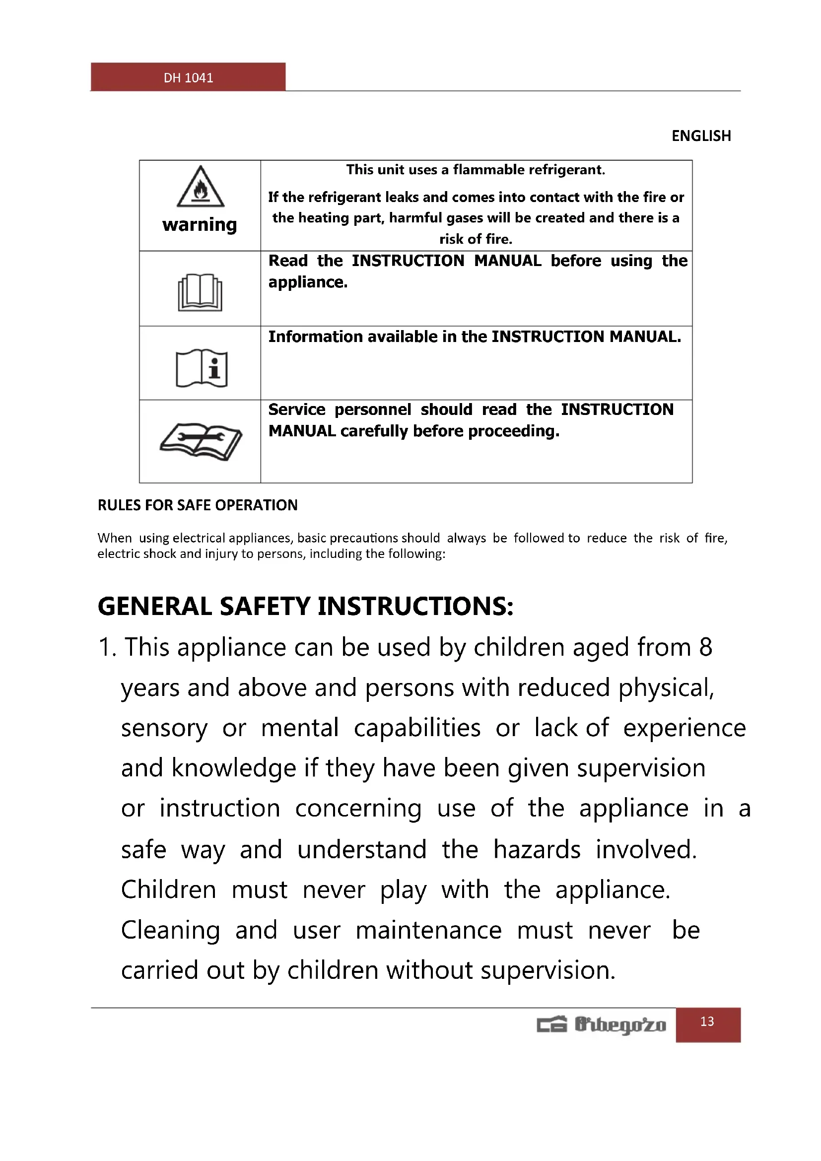 years and above and persons with reduced physical, sensory or mental capabilities or lack of experience and knowledge if they have been given supervision or instruction concerning use of the appliance in a safe way and understand the hazards involved. Children must never play with the appliance. Cleaning and user maintenance must never be carried out by children without supervision.DH 1041