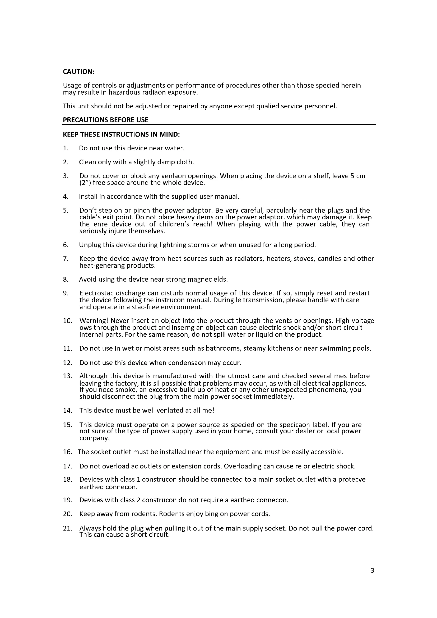 24. When the device is not in use for long periods, unplug the ac power adaptor for safety reasons.