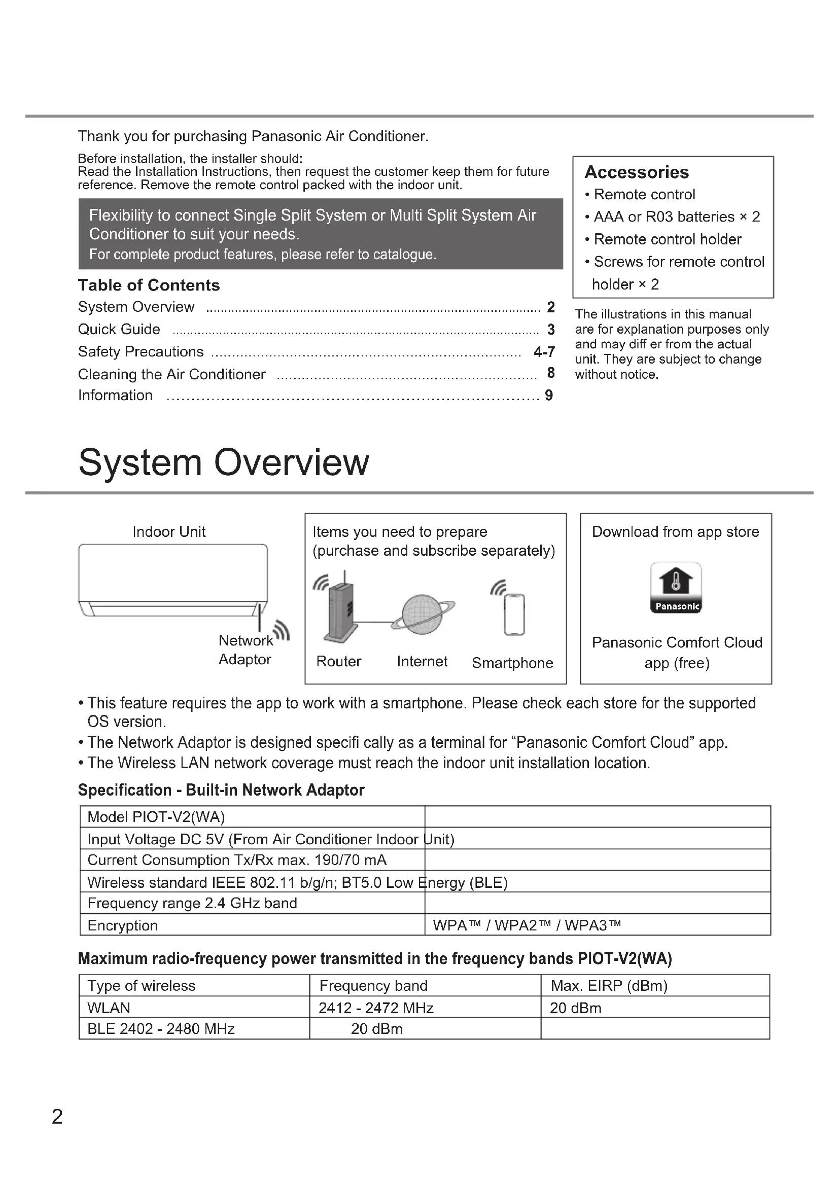 The Wireless LAN network coverage must reach the indoor unit installation location. Panasonic Download from app store Router Internet Smartphone Items you need to prepare (purchase and subscribe separately) Panasonic Comfort Cloud app (free) Indoor Unit Network Adaptor Model PIOT-V2(WA) Input Voltage DC 5V (From Air Conditioner Indoor Unit) Current Consumption Tx/Rx max. 190/70 mA Wireless standard IEEE 802.11 b/g/n; BT5.0 Low Energy (BLE) Frequency range 2.4 GHz band Encryption WPA™ / WPA2™ / WPA3™ Specifi cation - Built-in Network Adaptor Maximum radio-frequency power transmitted in the frequency bands PIOT-V2(WA) Type of wireless Frequency band Max. EIRP (dBm) WLAN 2412 - 2472 MHz 20 dBm BLE 2402 - 2480 MHz 20 dBm3