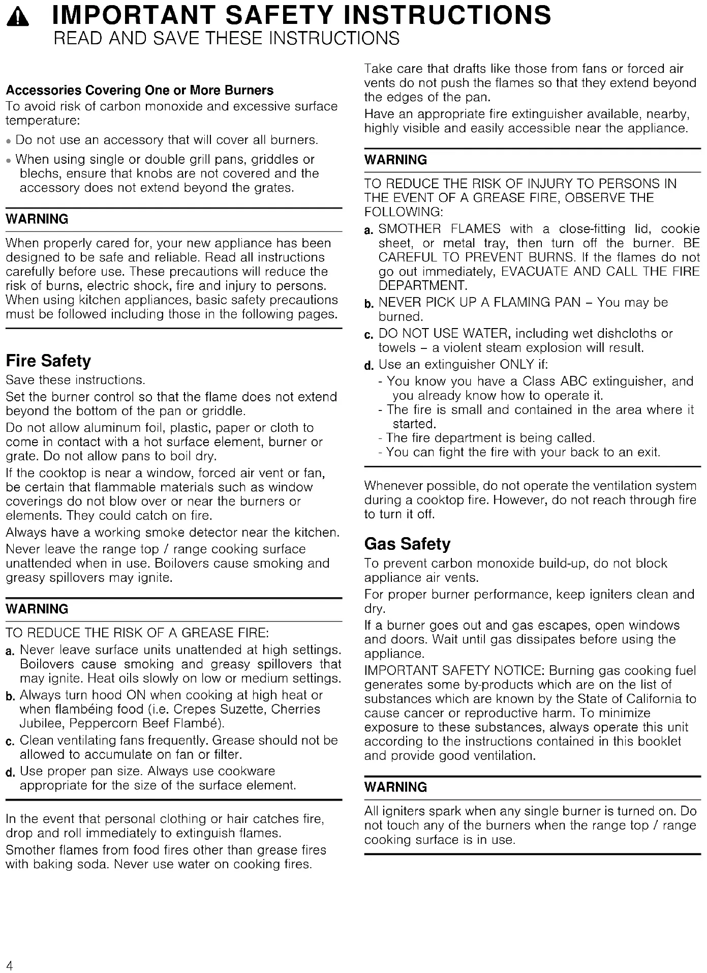 Accessories Covering One or More Burners To avoid risk of carbon monoxide and excessive surface temperature: ▯ Do not use an accessory that will cover all burners.▯ When using single or double grill pans, griddles or blechs, ensure that knobs are not covered and the accessory does not extend beyond the grates. WARNING When properly cared for, your new appliance has been designed to be safe and reliable. Read all instructions carefully before use. These precautions will reduce the risk of burns, electric shock, fire and injury to persons. When using kitchen appliances, basic safety precautions must be followed including those in the following pages. Fire Safety Save these instructions. Set the burner control so that the flame does not extend beyond the bottom of the pan or griddle. Do not allow aluminum foil, plastic, paper or cloth to come in contact with a hot surface element, burner or grate. Do not allow pans to boil dry. If the cooktop is near a window, forced air vent or fan, be certain that flammable materials such as window coverings do not blow over or near the burners or elements. They could catch on fire. Always have a working smoke detector near the kitchen. Never leave the range top / range cooking surface unattended when in use. Boilovers cause smoking and greasy spillovers may ignite. WARNING TO REDUCE THE RISK OF A GREASE FIRE: